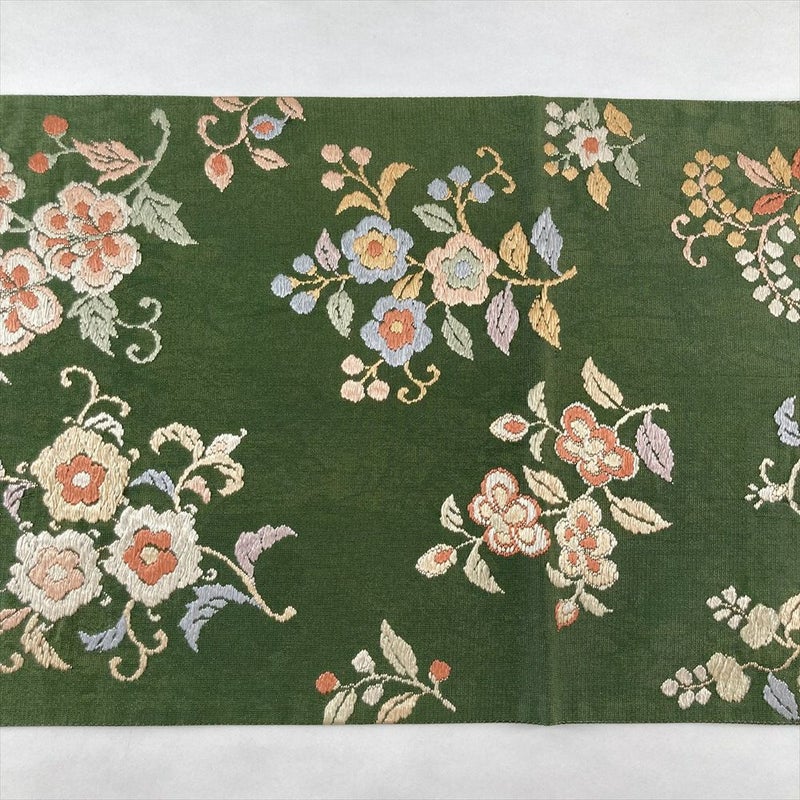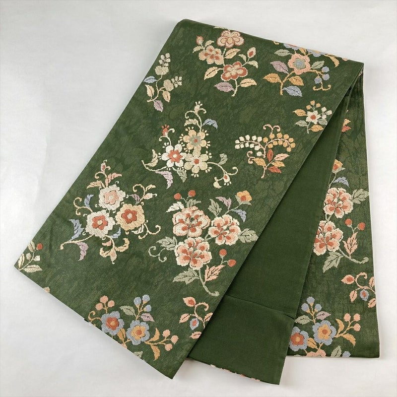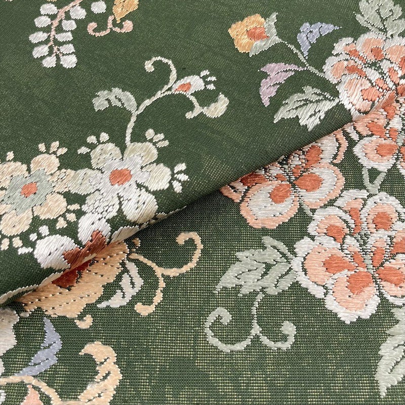 天平の花文様が織りなす、千歳緑(ちとせみどり)の深い色合いが特徴。