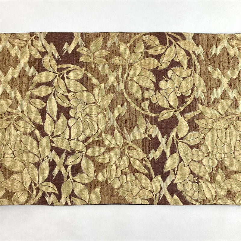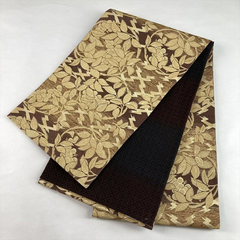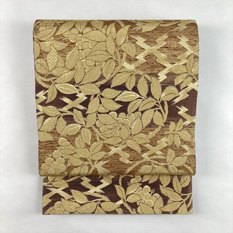 (中古)袋帯 金 茶 セミフォーマル 全通 金糸 色糸 輪奈織 植物文 絹