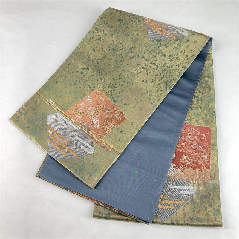 (中古)袋帯 金緑 セミフォーマル フォーマル 六通 引き箔 金糸 銀糸 色紙文 絹