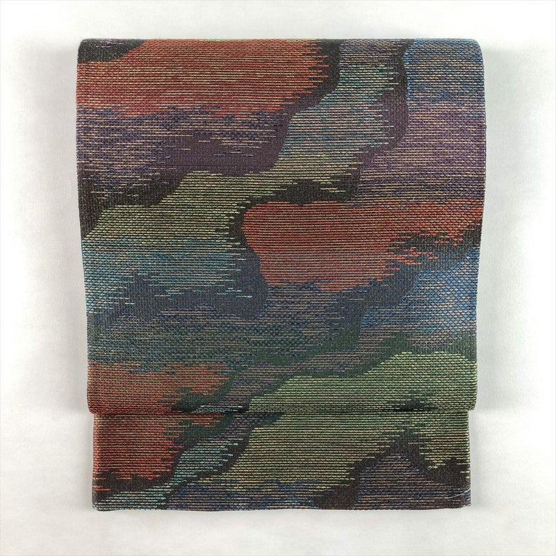 (中古)袋帯 赤 紺 緑 マルチカラー カジュアル セミフォーマル 六通 金糸 色糸 霞 絹