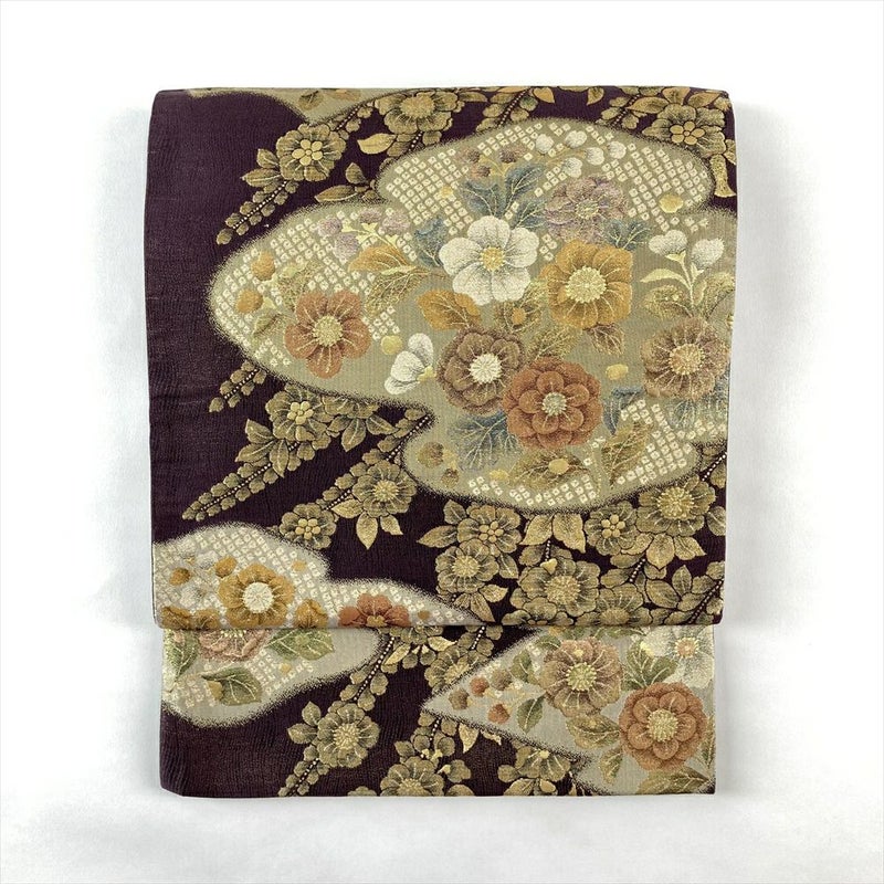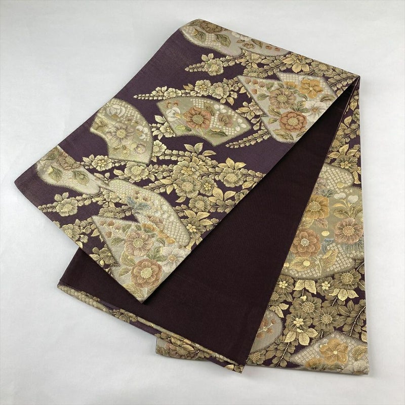 (中古)袋帯 紫 金 セミフォーマル 六通 引き箔 扇面 雲 辻が花 絹