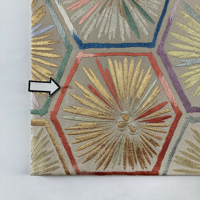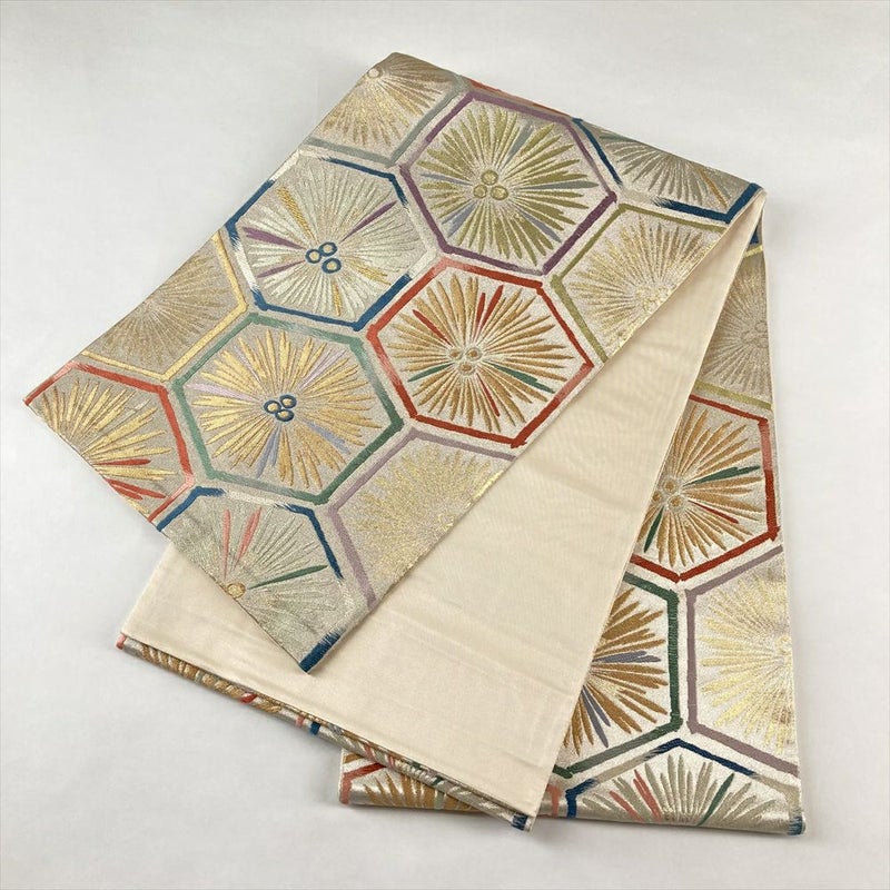 (中古)袋帯 白金 銀 フォーマル 六通 金糸 銀糸 色糸 亀甲 菊 絹