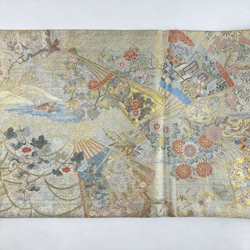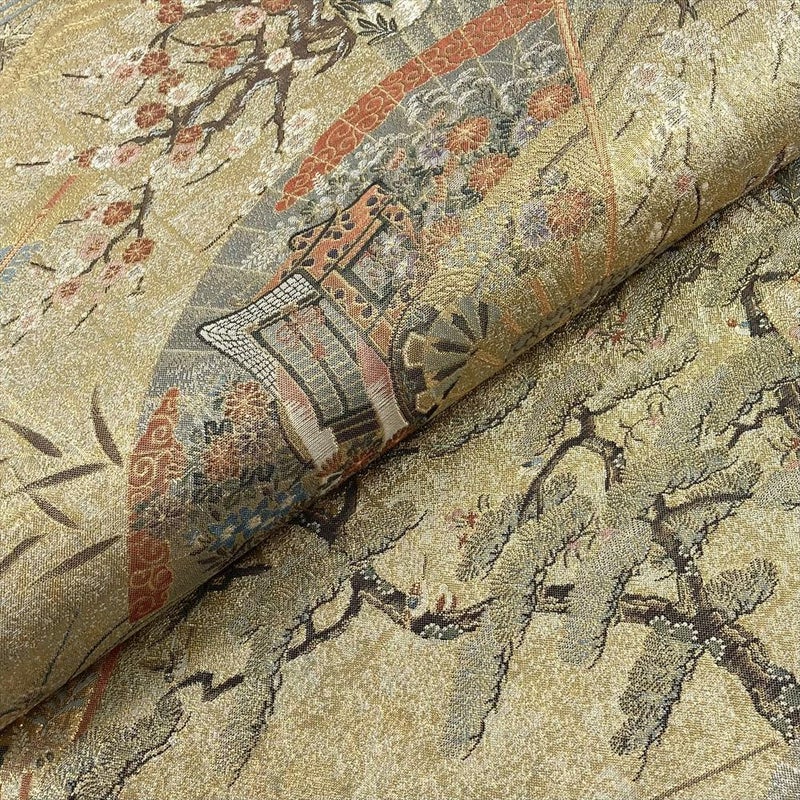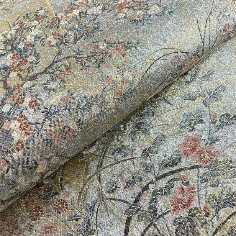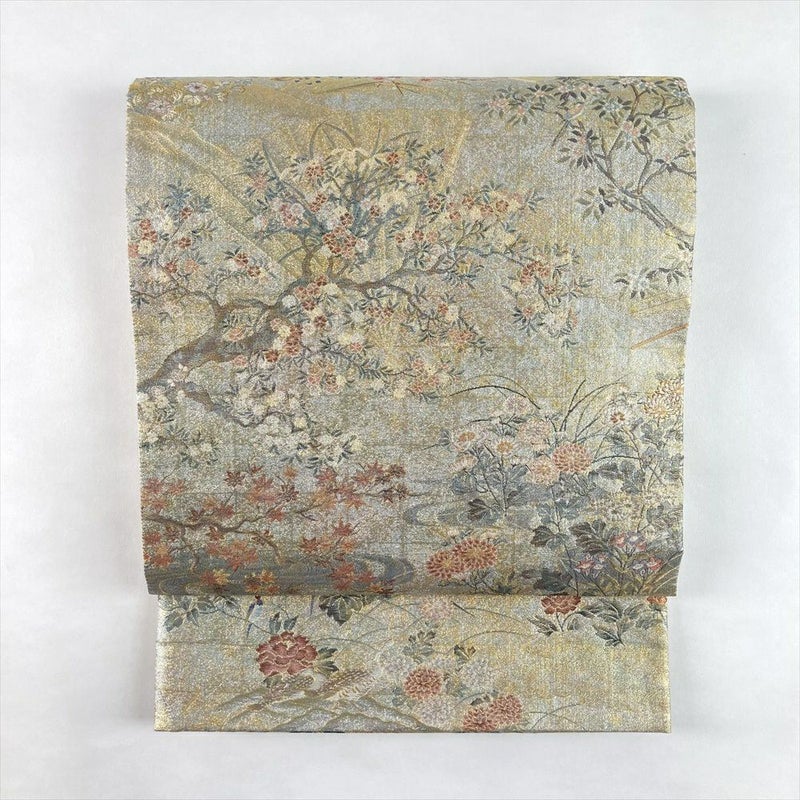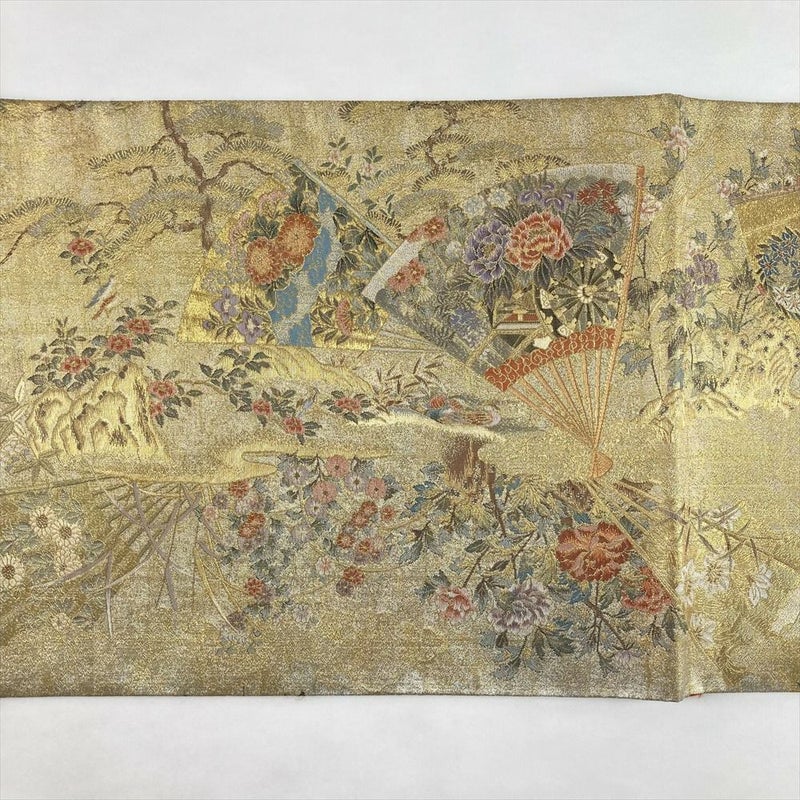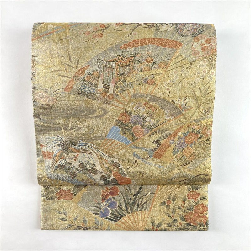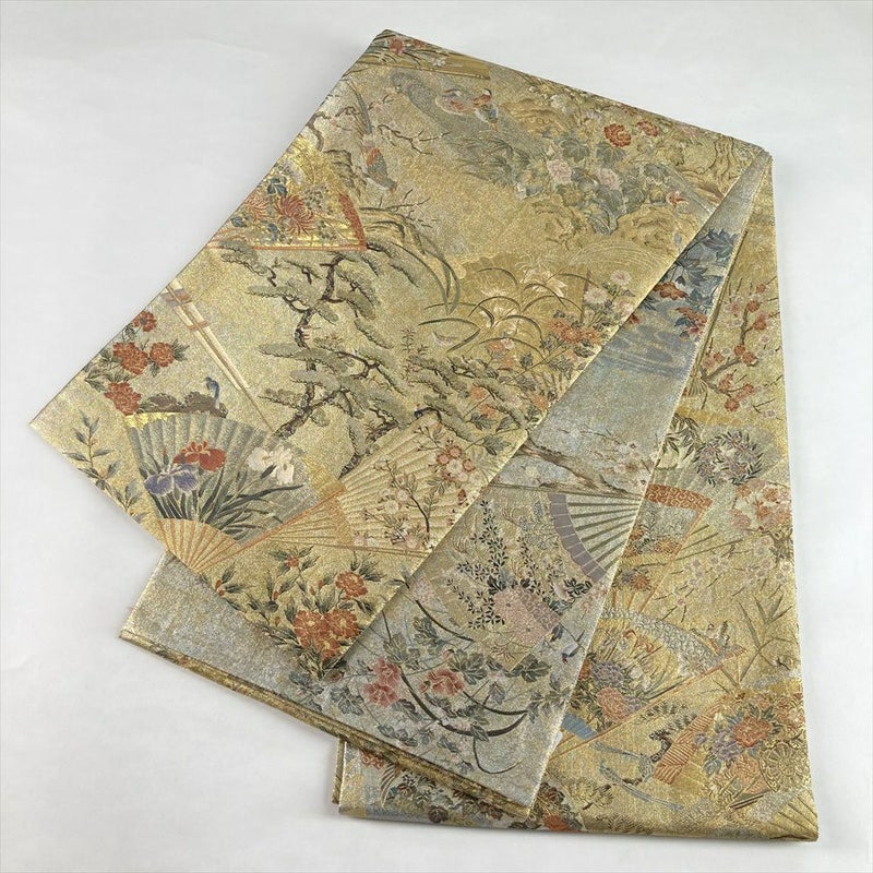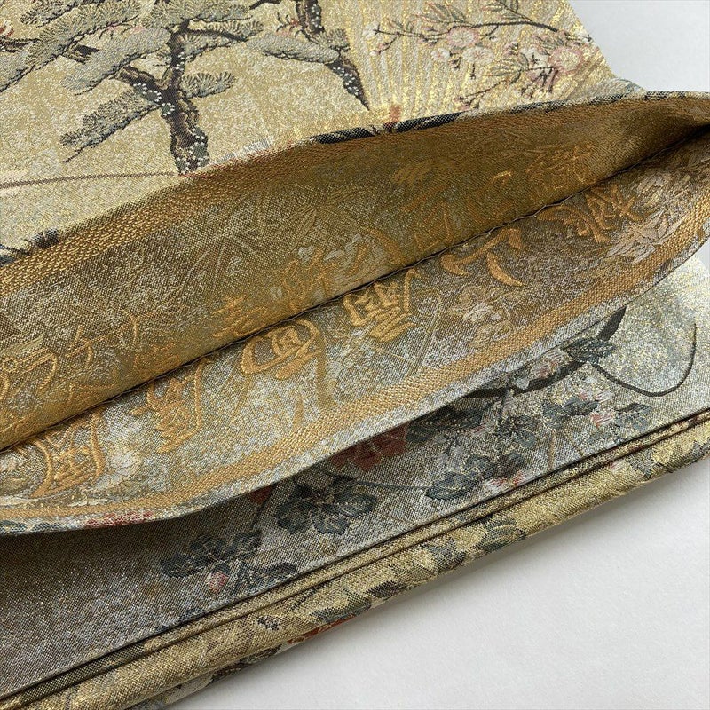 (中古)袋帯 金 セミフォーマル フォーマル 両面全通 リバーシブル 金糸 銀糸 扇 四季花 絹