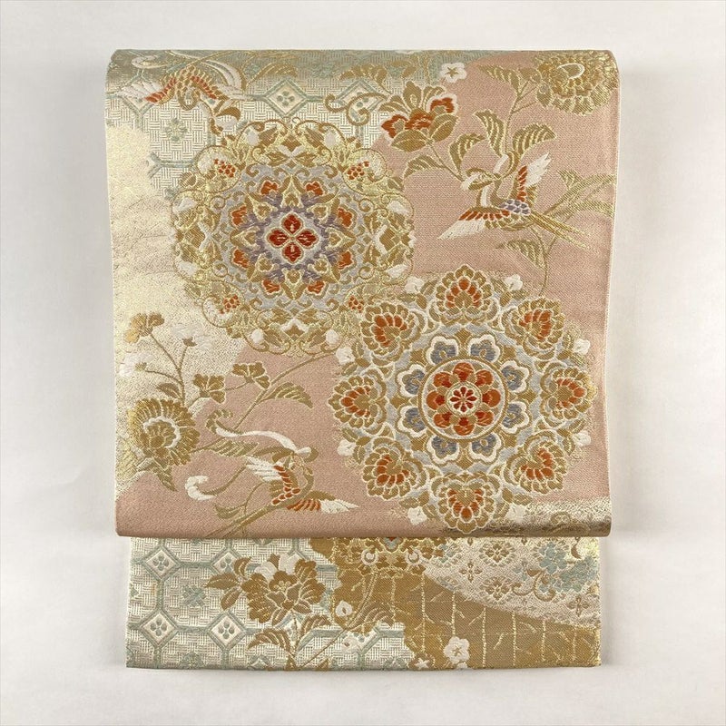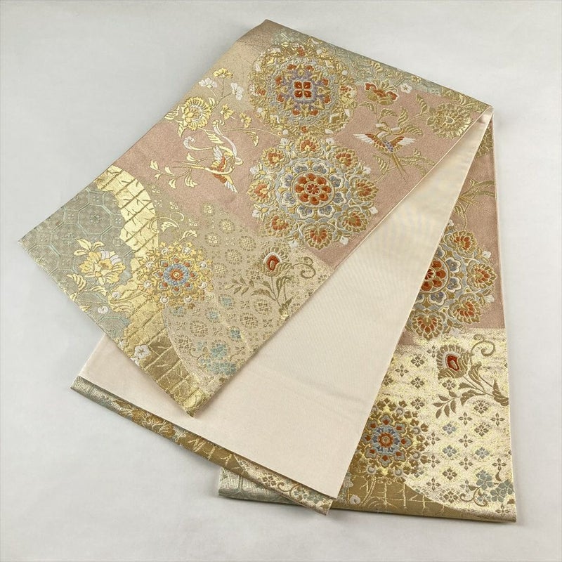 (中古)袋帯 金 セミフォーマル フォーマル 六通 引き箔 金糸 華文 花喰い鳥 絹
