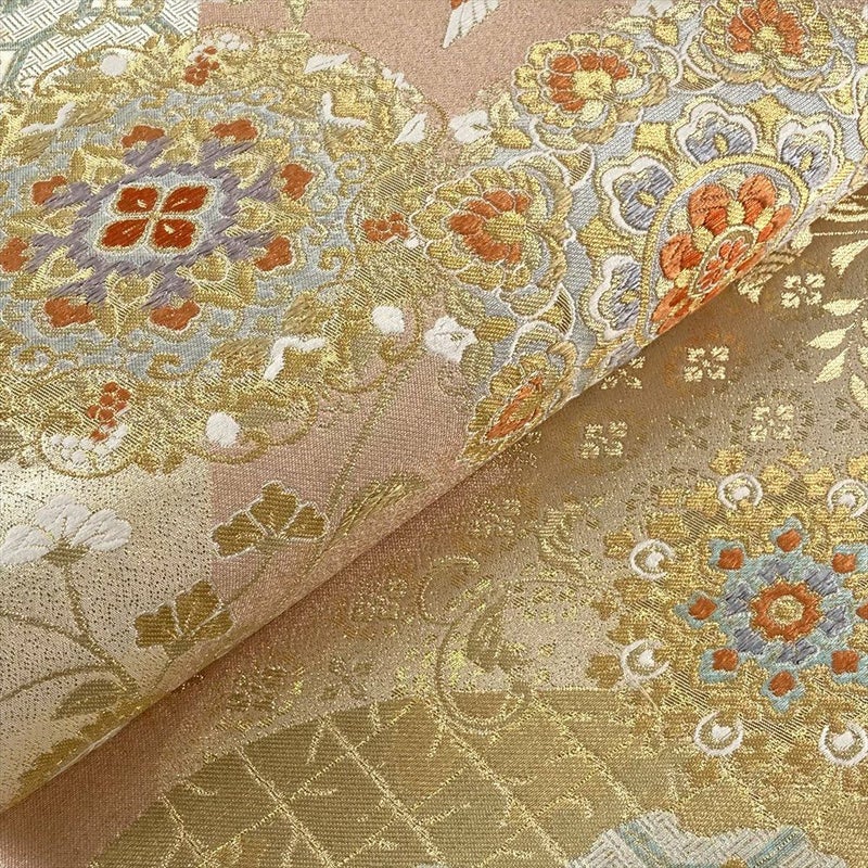セミフォーマルシーンに格調を添える、花喰い鳥と華文が織りなす袋帯です。
