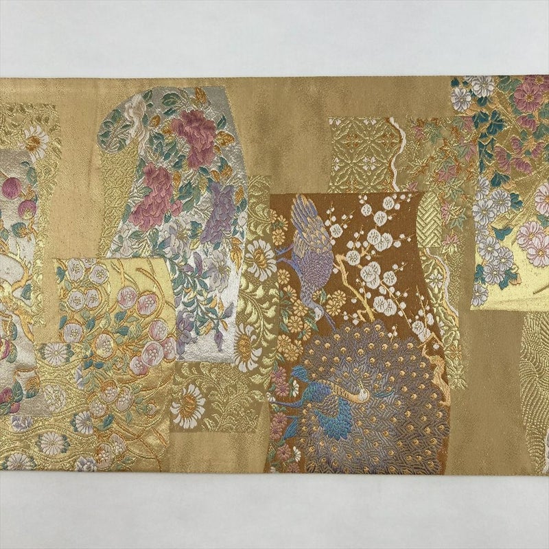 (中古)袋帯 金 フォーマル 六通 引き箔 金糸 光琳孔雀図 絹