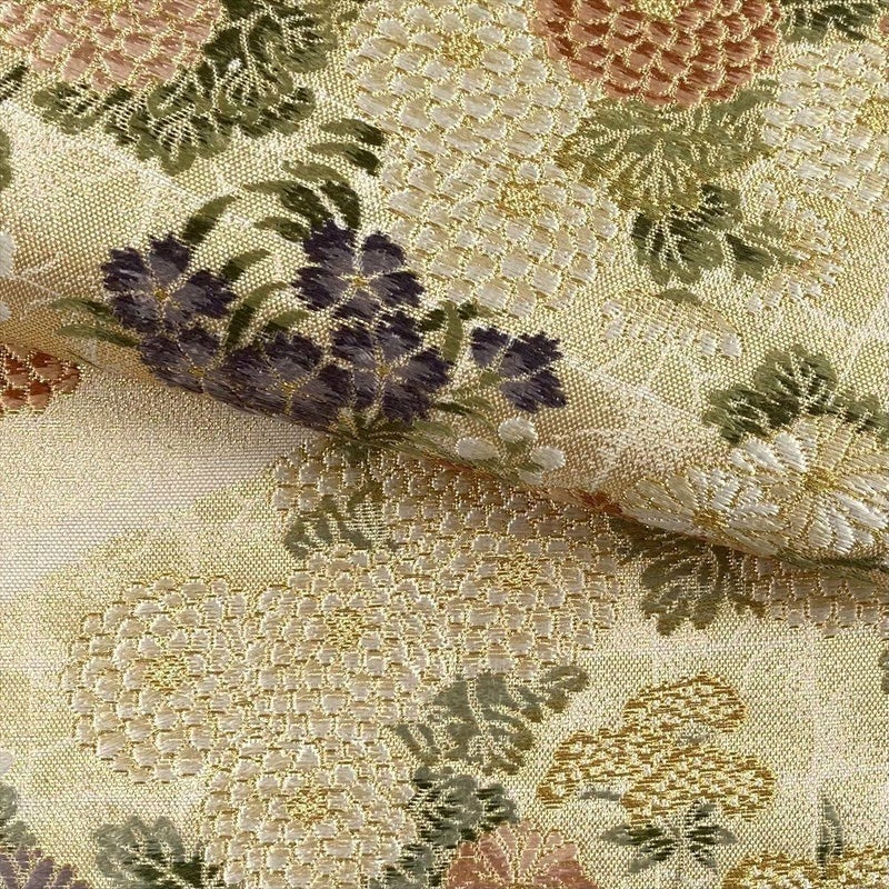 華やかな金色の地に、秋草の代表である菊、竜胆、撫子を大胆に配置しました。それぞれの花が持つ優美な姿が、見る人の心を引きつけます。