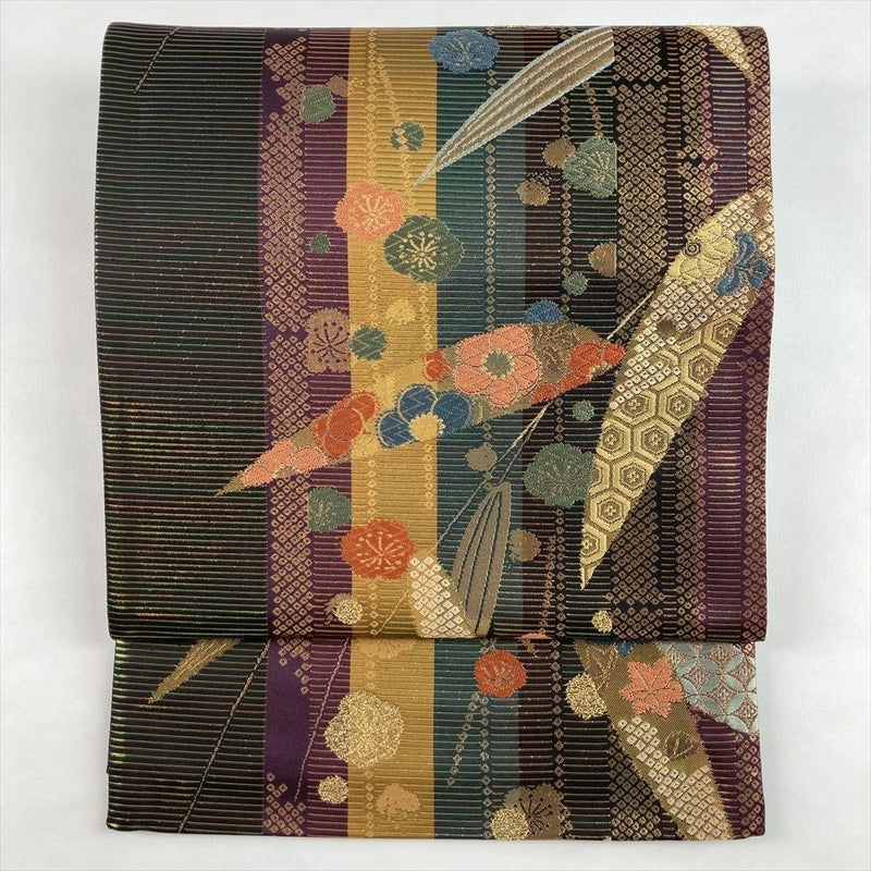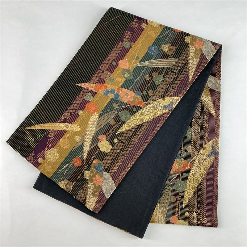 【伝統とモダン】洒落袋帯 間道に笹と梅