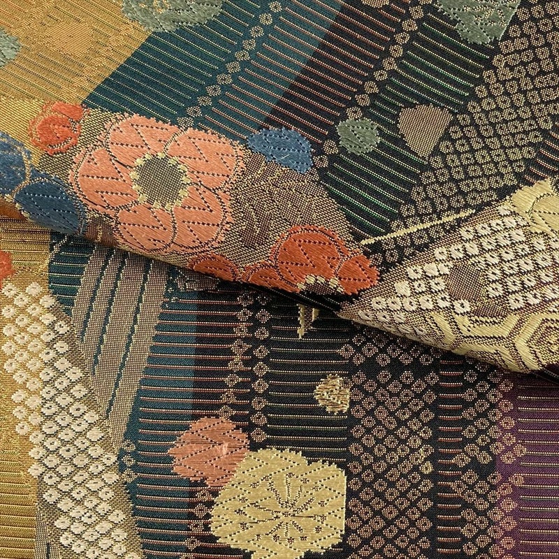 日本の伝統的な間道(かんどう)文様と、吉祥柄である笹や梅を組み合わせた洒落袋帯です。