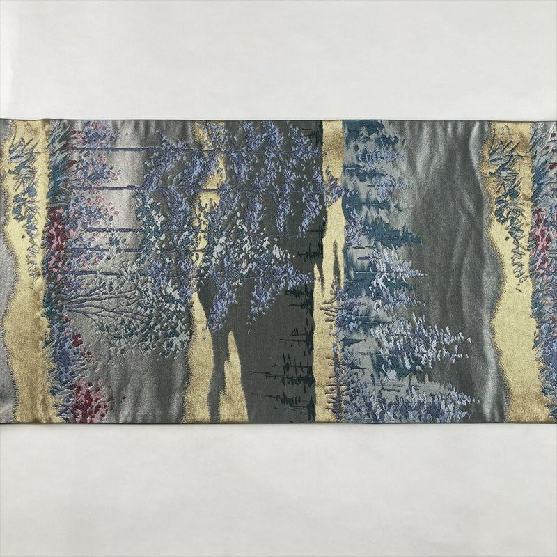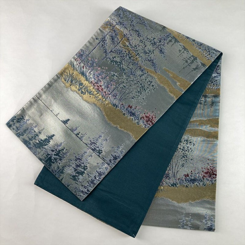 気品ある銀地に、金糸・銀糸で織り上げられた風景文様が美しく広がる袋帯。