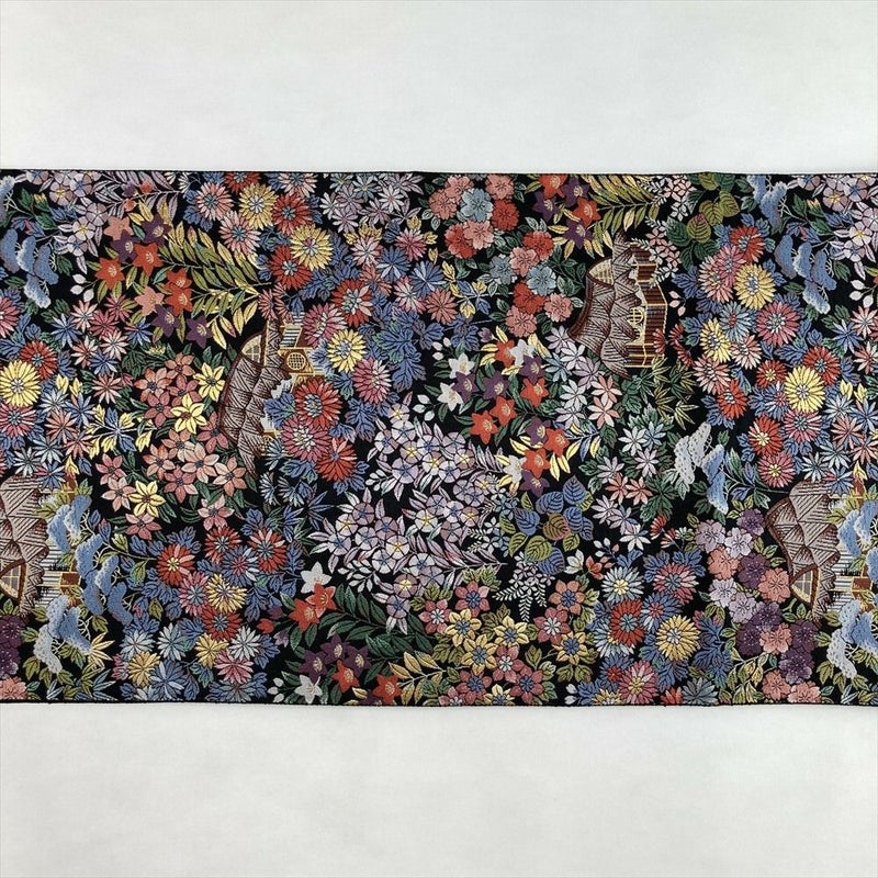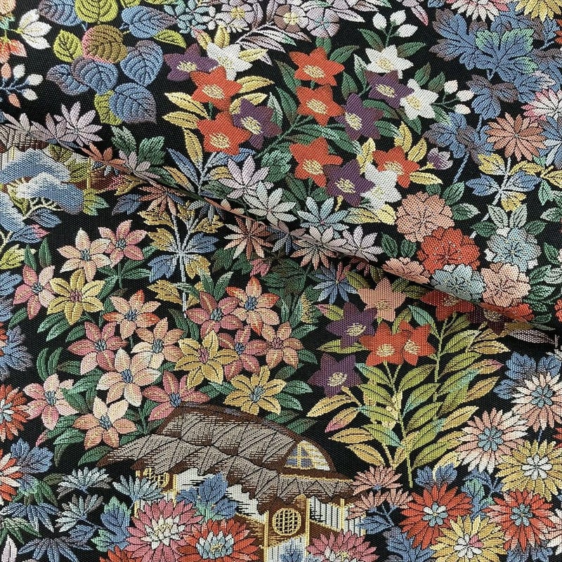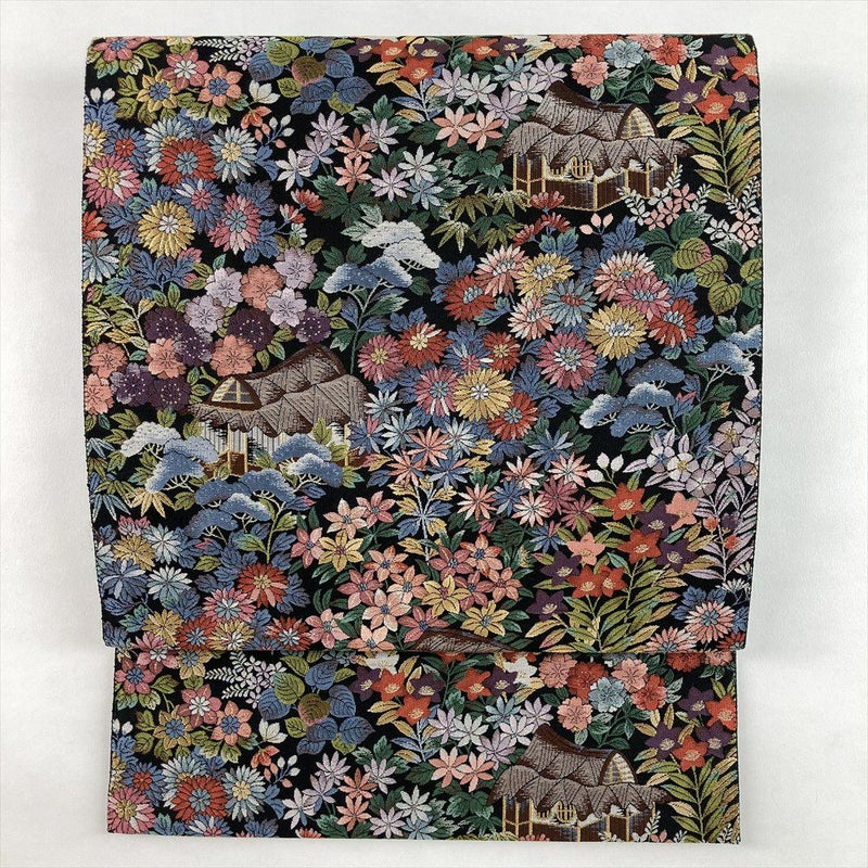 重厚感のある黒地に、色糸で織り上げられた四季花と小屋の情景が華やかに映える袋帯。