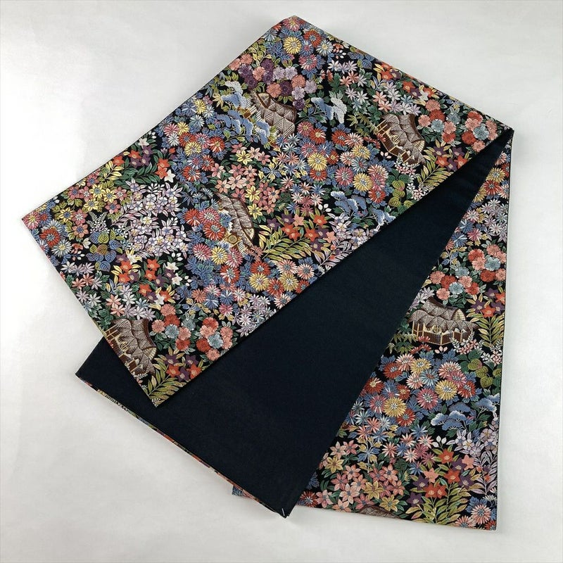 (中古)袋帯 黒 フォーマル 六通 織り 色糸 四季花 小屋 絹