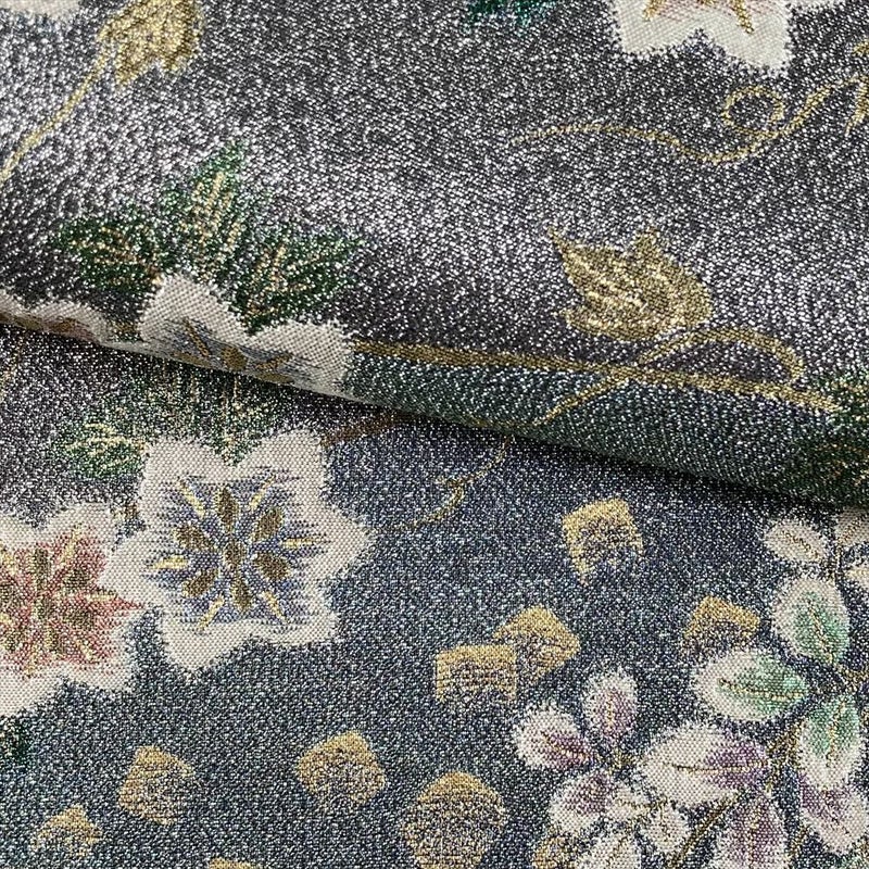 まるで光を宿したかのように煌めく金糸や銀糸が、花びらの繊細な輝きを表現し、見る角度によって表情を変えます。