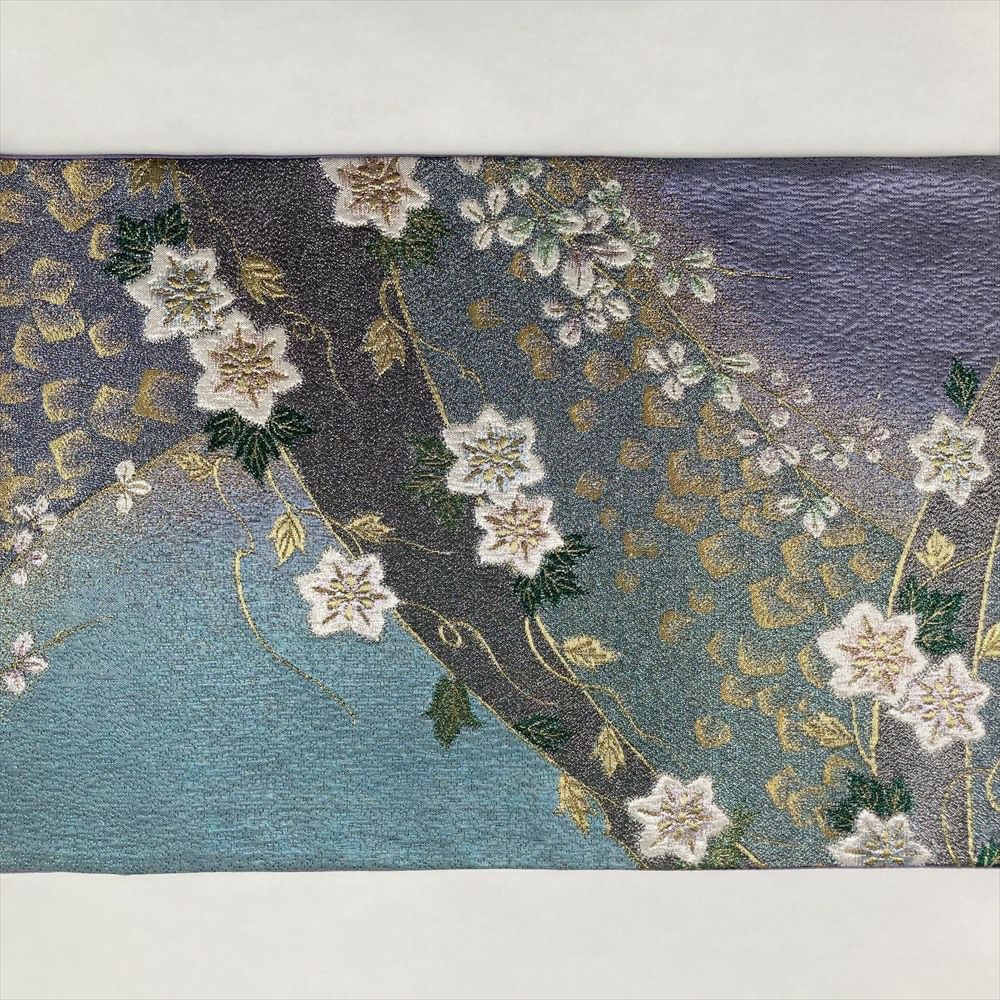 清涼感あふれる水色や青を基調に、優美に咲くクレマチス(鉄線)の柄が織り上げられています。