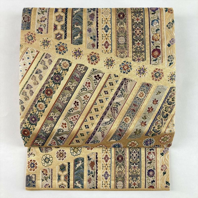 (中古)袋帯 金 セミフォーマル フォーマル 六通 金糸 銀糸 色糸 鬘帯文 壱千八百口織 絹