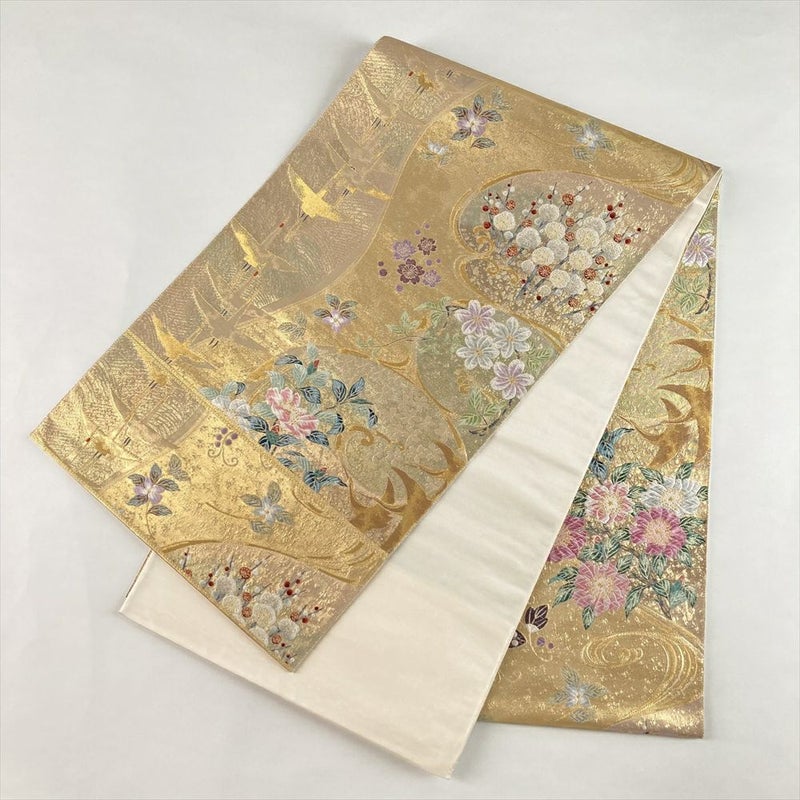(中古)袋帯 金 フォーマル 六通 引き箔 金糸 花 鶴 絹