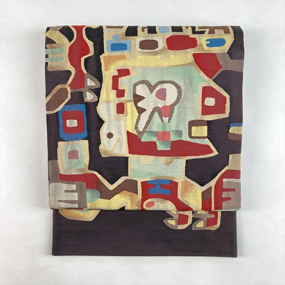 (中古)袋帯 焦げ茶 カジュアル 六通 すくい織 コプト文様 絹