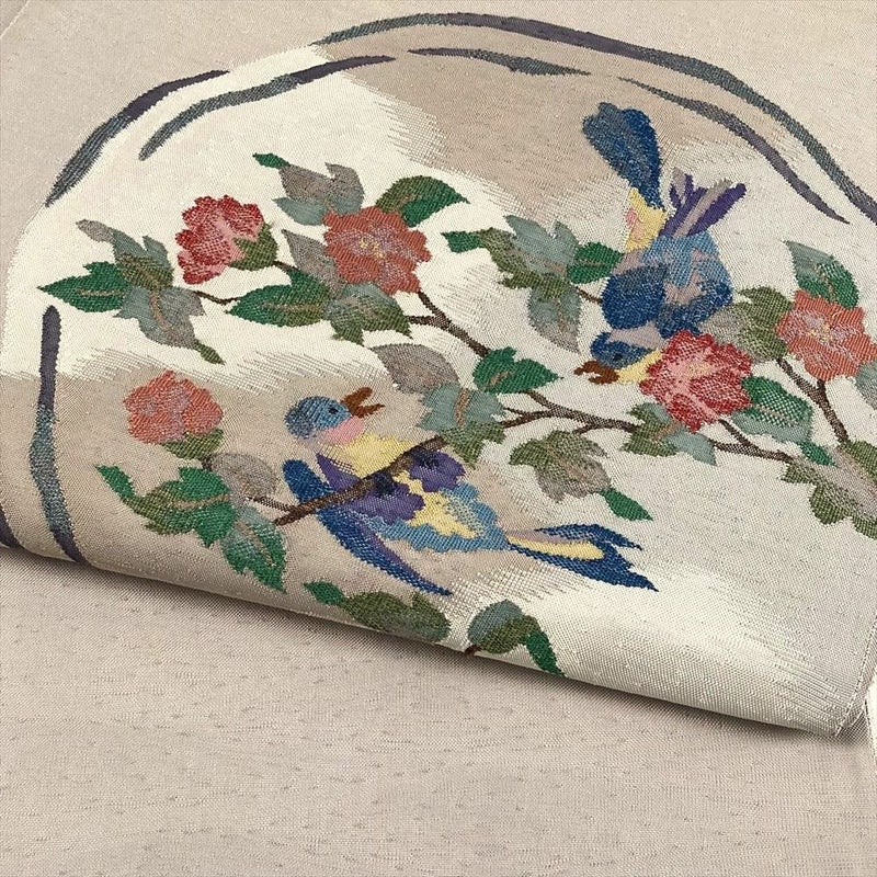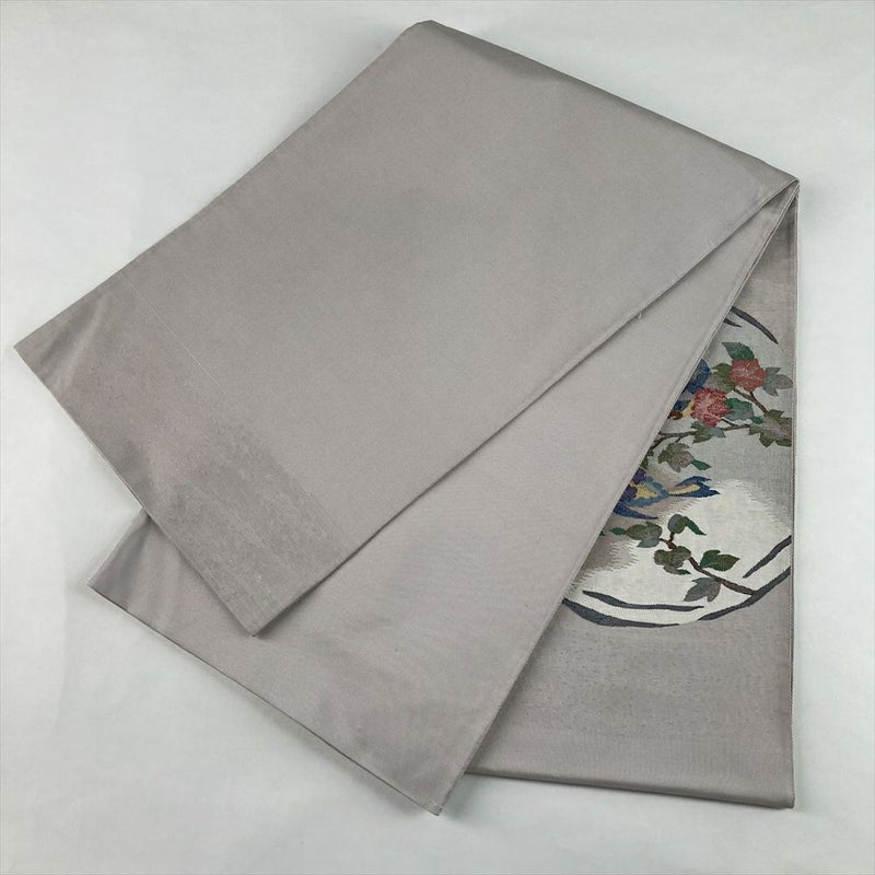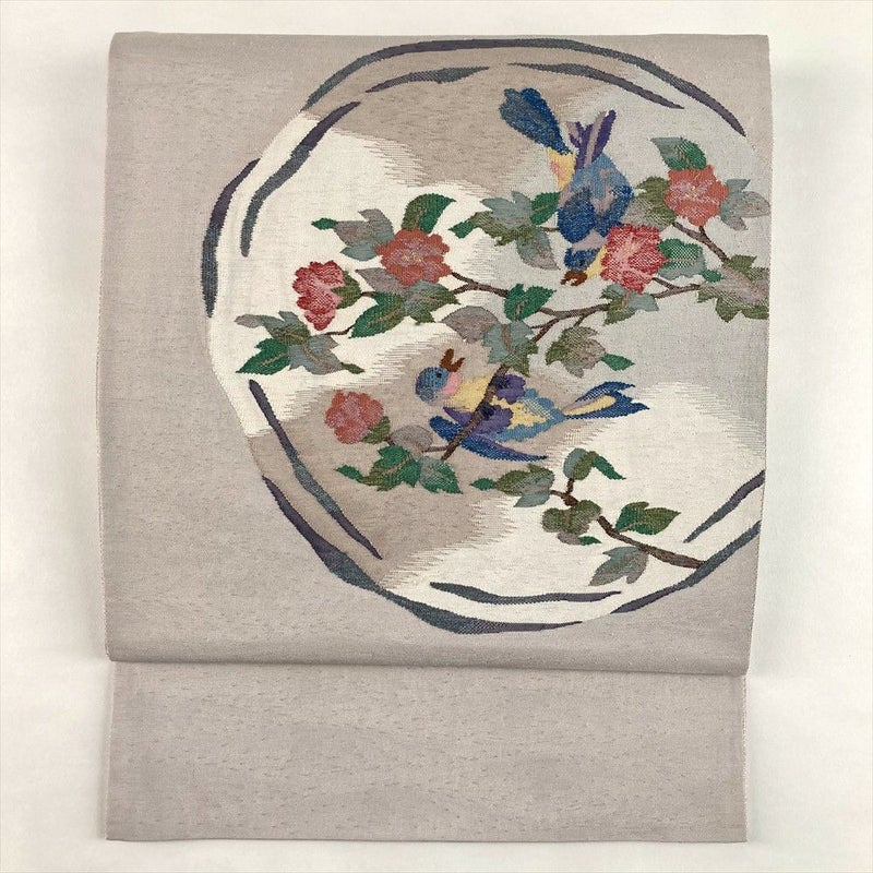 落ち着いた梅鼠色の帯地に、優美な花鳥文様がふっくらと浮かび上がります。