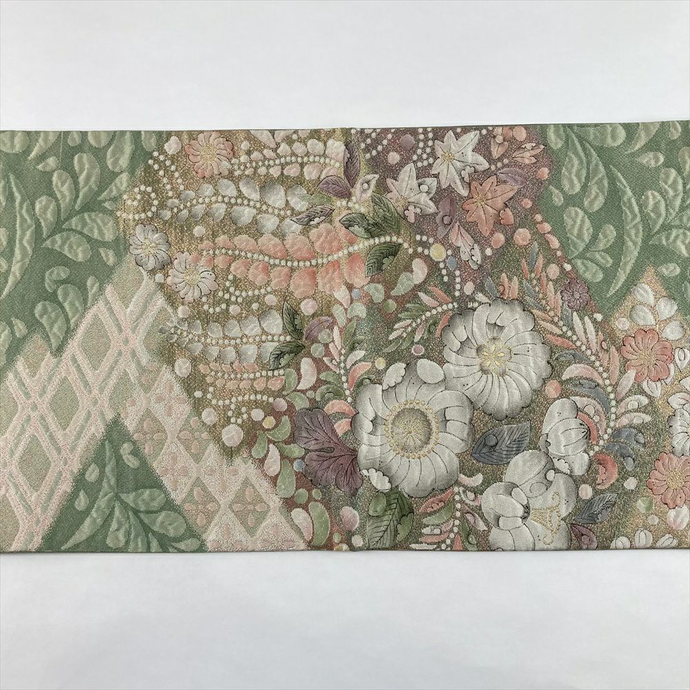 (中古)袋帯 薄緑 セミフォーマル フォーマル 六通 織り 辻が花 絹