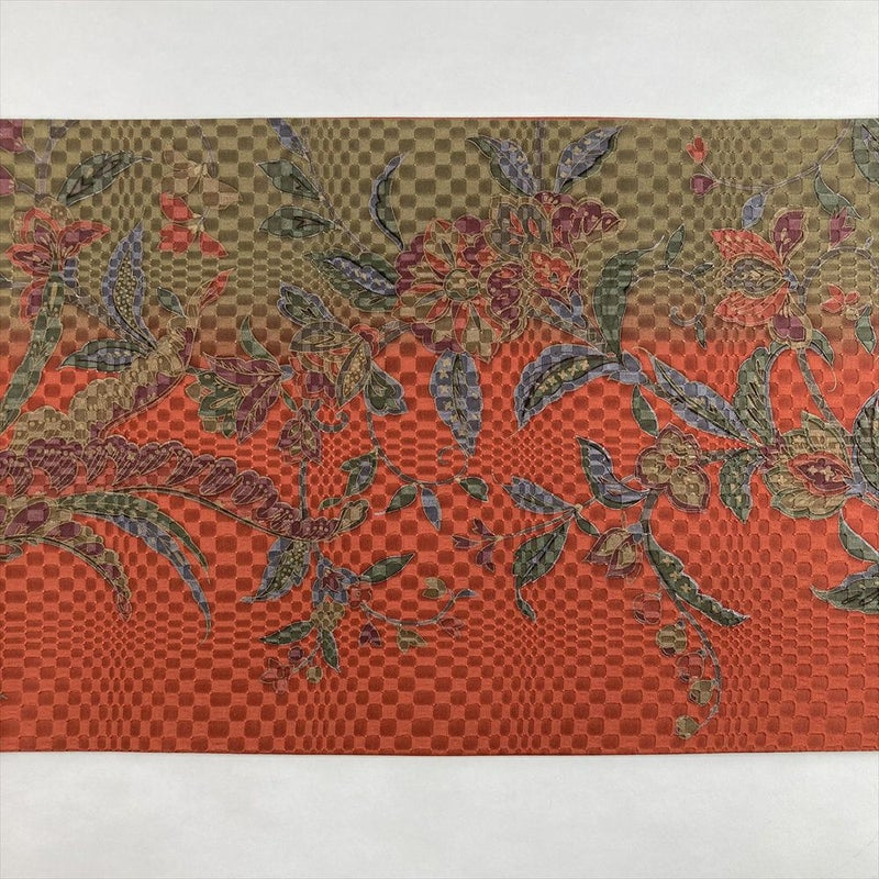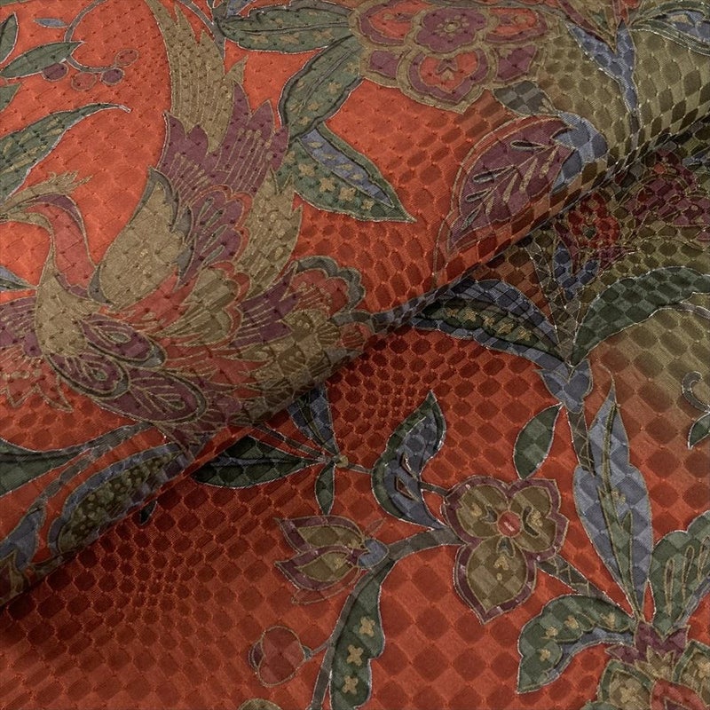 【色柄】朱赤 柳茶 緑 カジュアル オリエンタル花鳥文 地紋織 染め 全通