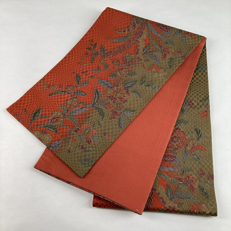 (中古)袋帯 朱赤 柳茶 緑 カジュアル 全通 地紋織 染め オリエンタル花鳥文 絹