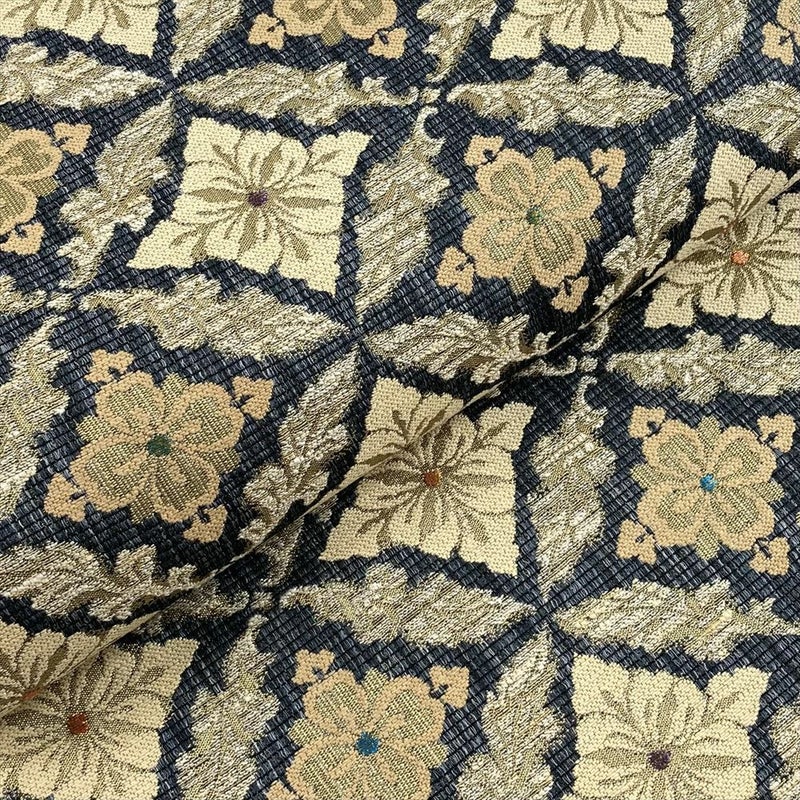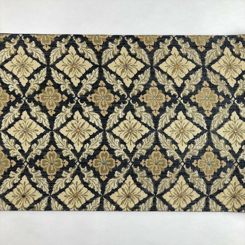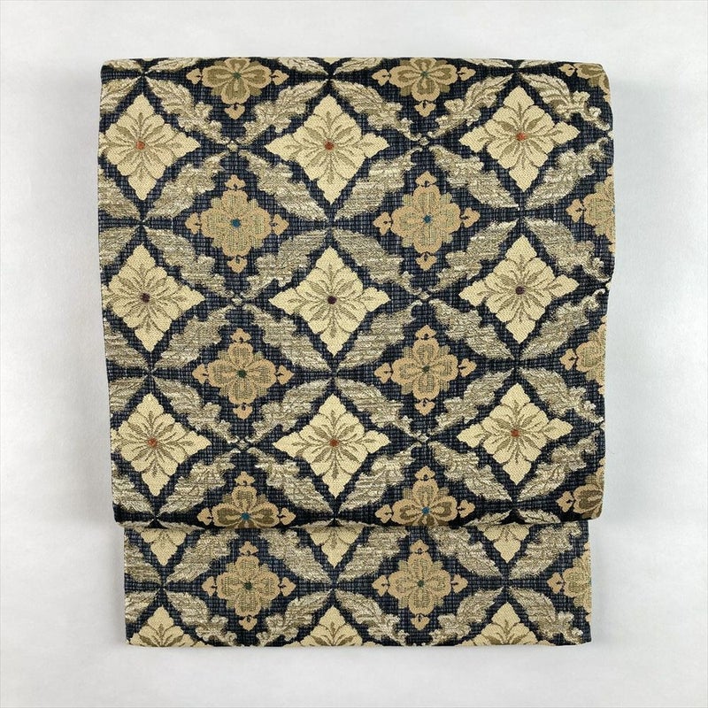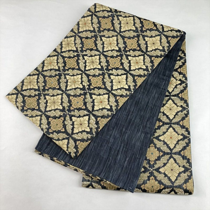 (中古)袋帯 紺 金ベージュ カジュアル セミフォーマル 六通 金糸 色糸 七宝 植物文 菱形 絹