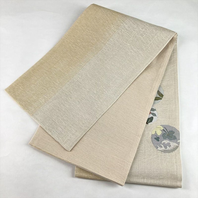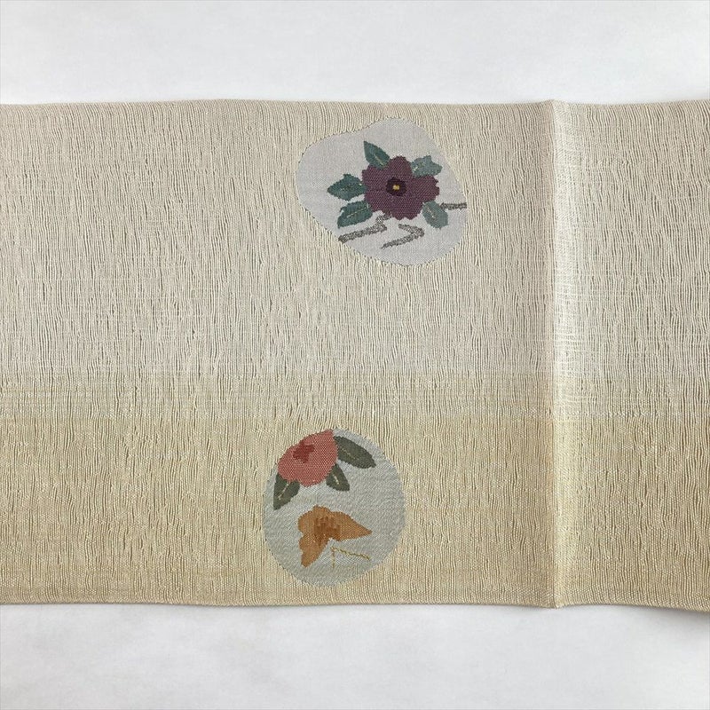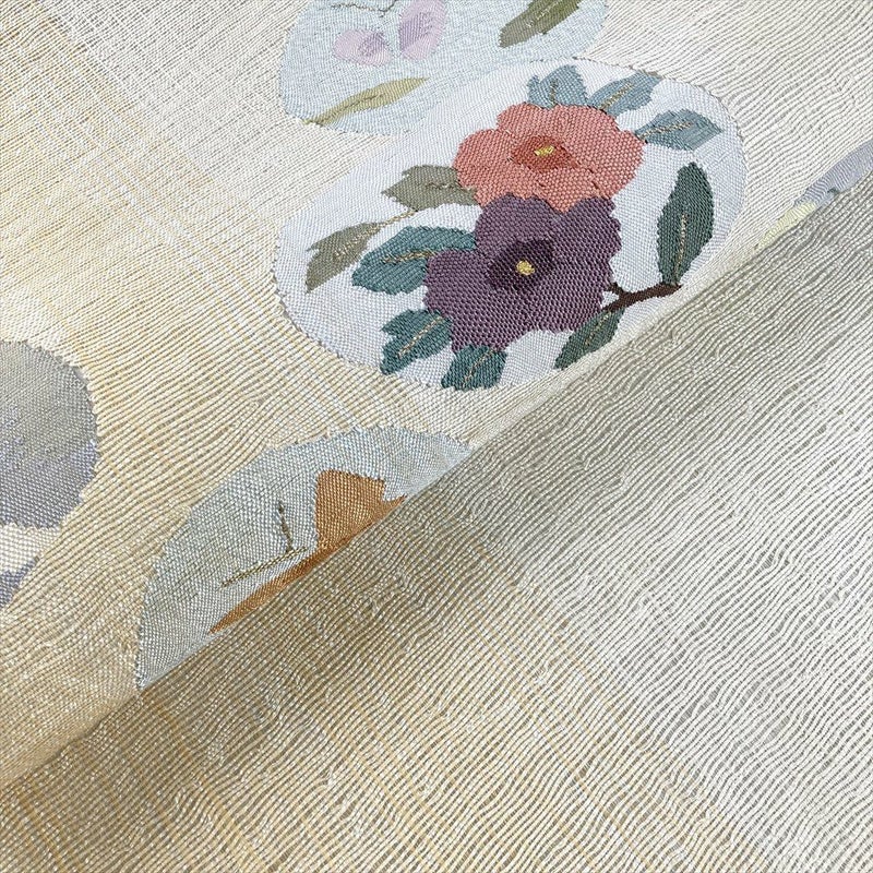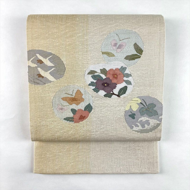 (中古)袋帯 淡黄 アイボリー カジュアル 六通 色糸 花の丸 絹