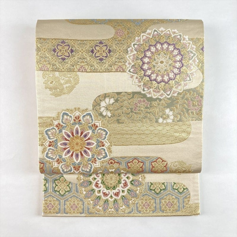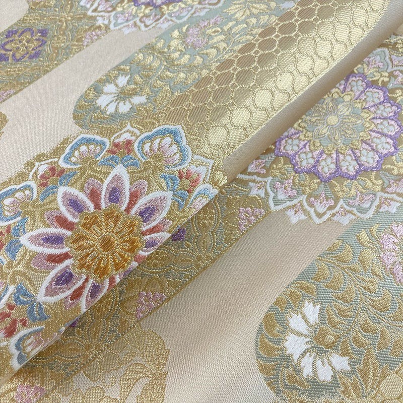 煌めく金色に、おめでたい華文が咲き誇る、フォーマルな袋帯です。