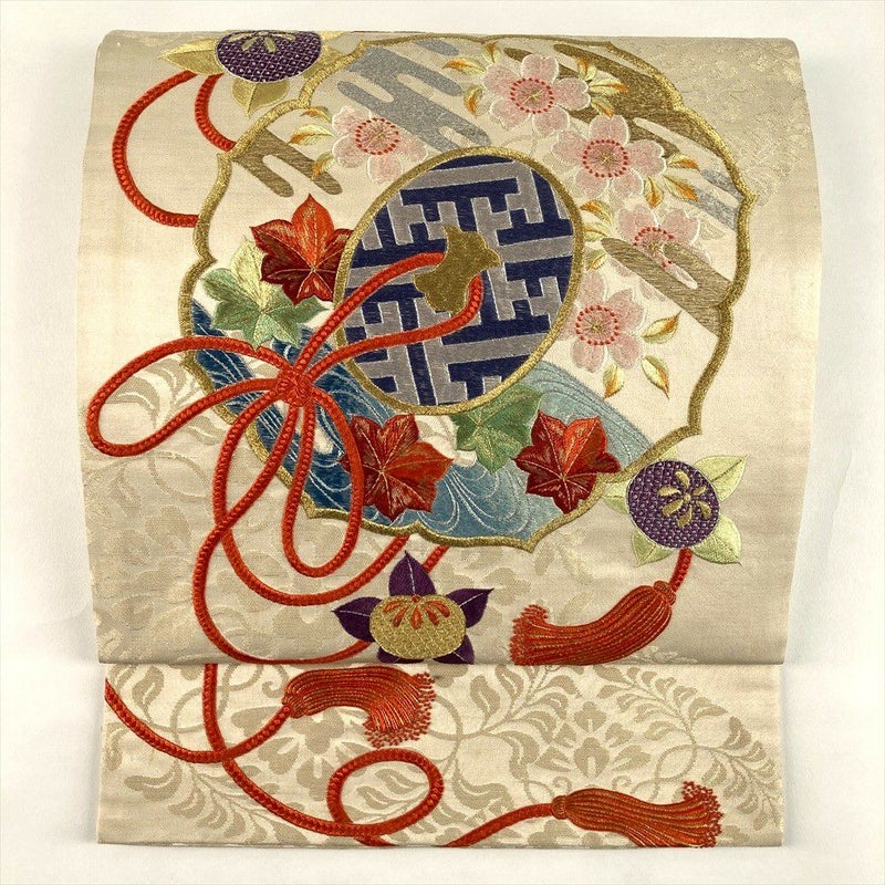 生成りの地に鏡文と花の刺繍が優雅に映える袋帯。