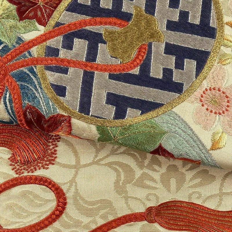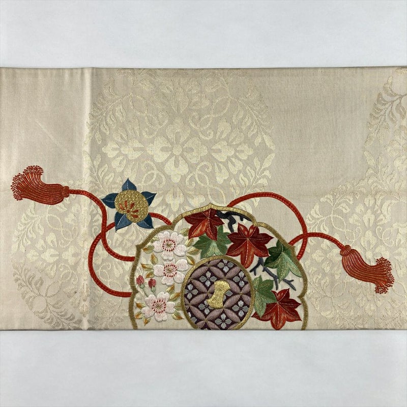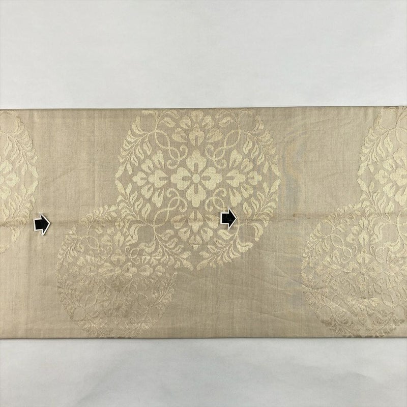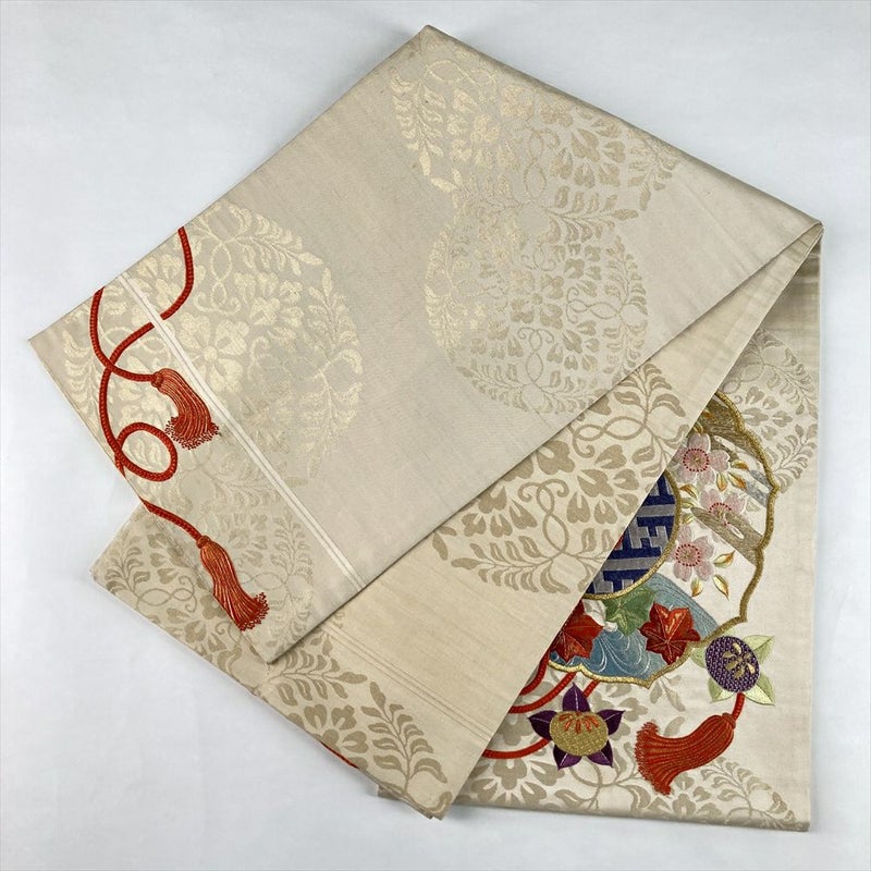 (中古)袋帯 生成 ヴィンテージ 六通 刺繍 金糸 色糸 鏡裏文 八つ藤文 絹