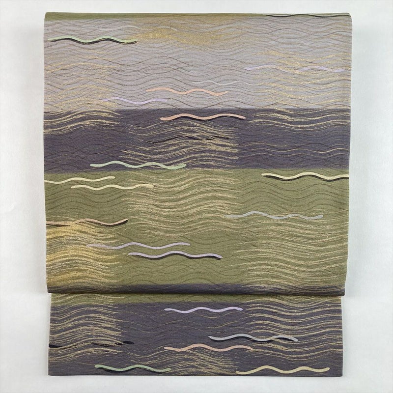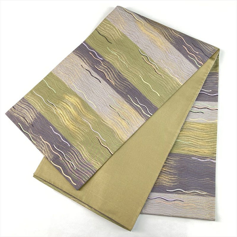 (中古)袋帯 緑 紫 マルチカラー カジュアル 全通 牛首紬 染め 金彩 波文 絹