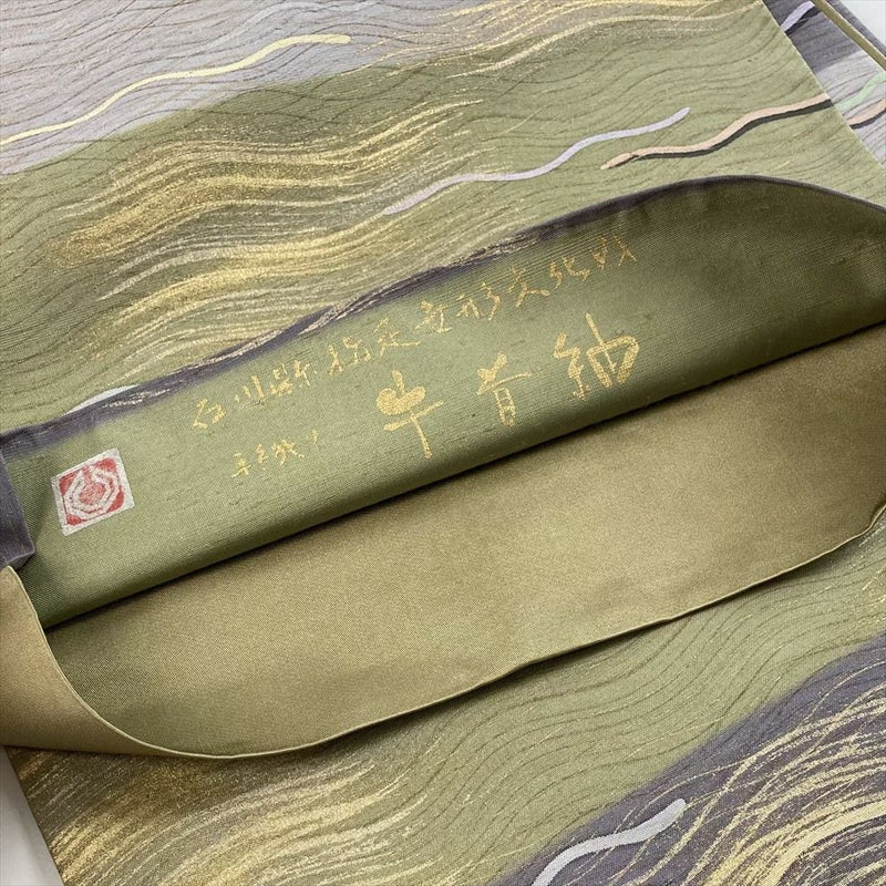 独特のしなやかな地風に、モダンな波文様を織り、染め、金彩で表現した贅沢な一本。