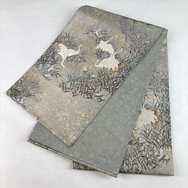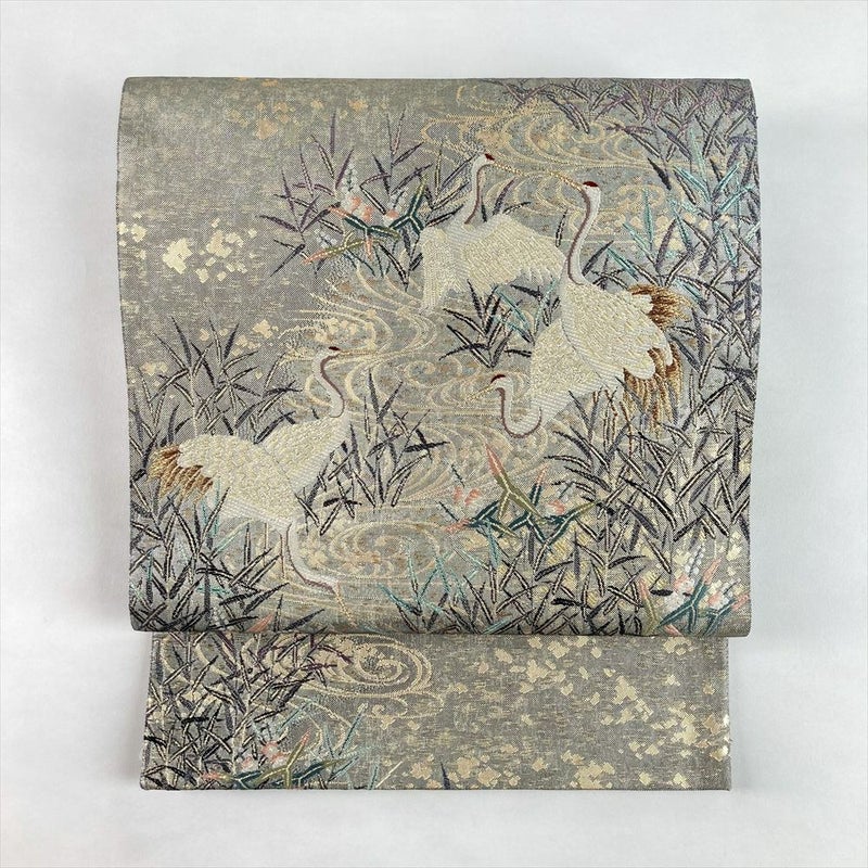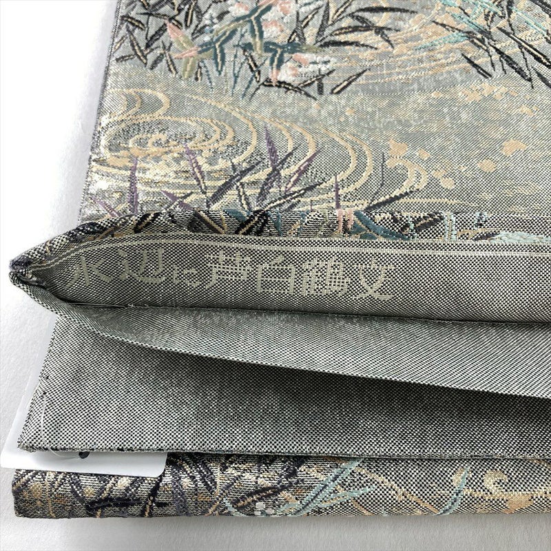 (中古)袋帯 銀 セミフォーマル 六通 織り 水辺 鶴 葦 沢潟 絹
