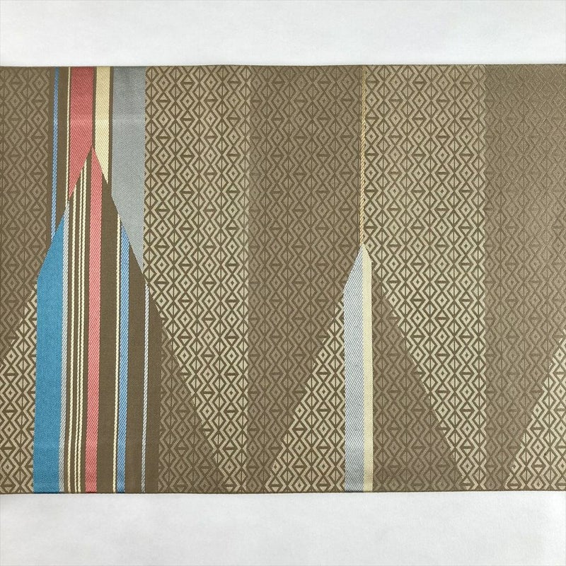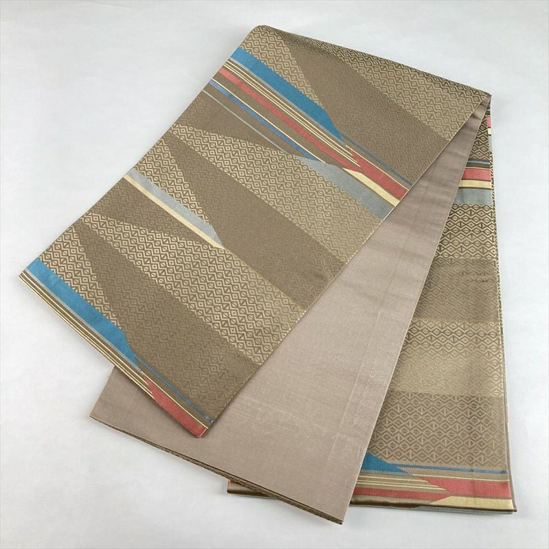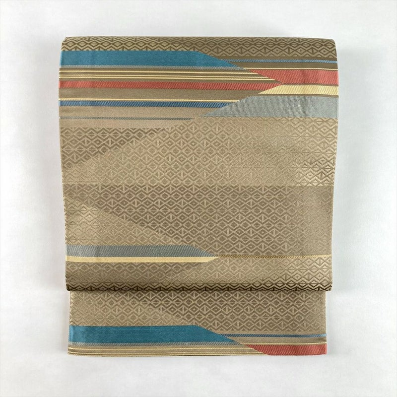 やわらかな砂色の地に、幾何学文様がモダンに映えるセミフォーマル向けの袋帯です。