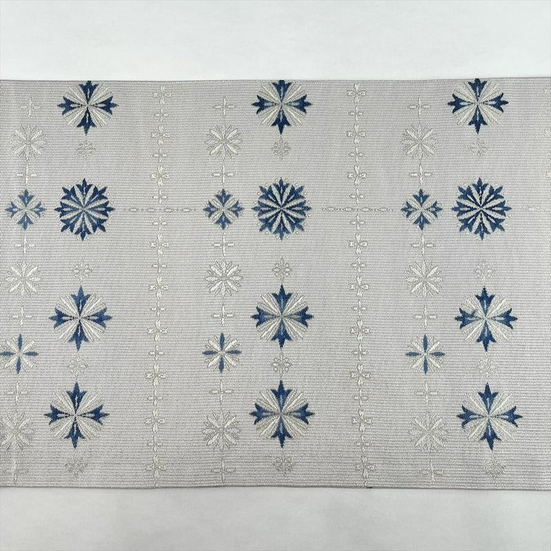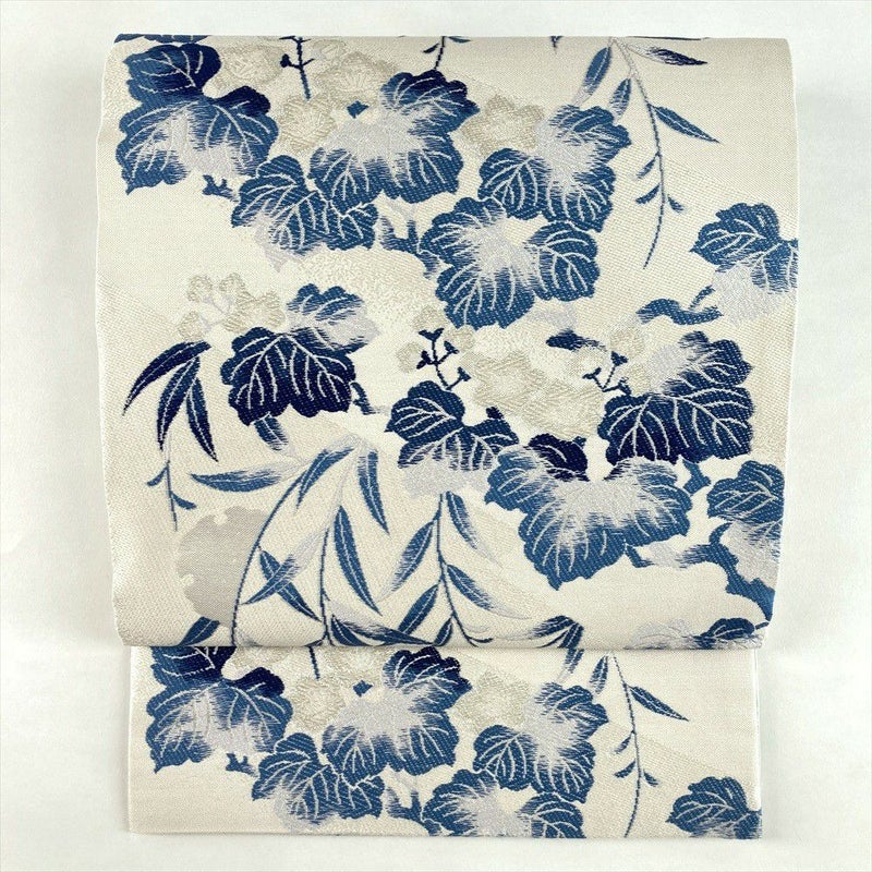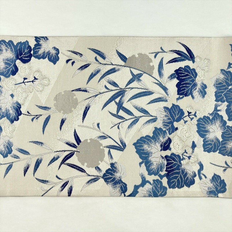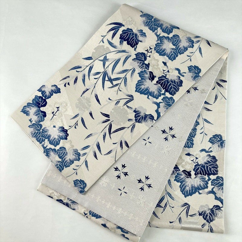 (中古)袋帯 白 水色 セミフォーマル 両面六通 銀糸 色糸 桐文 雪花文 絹