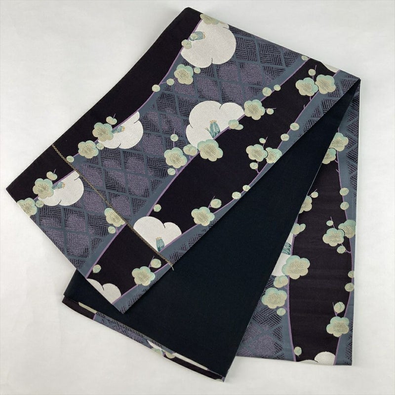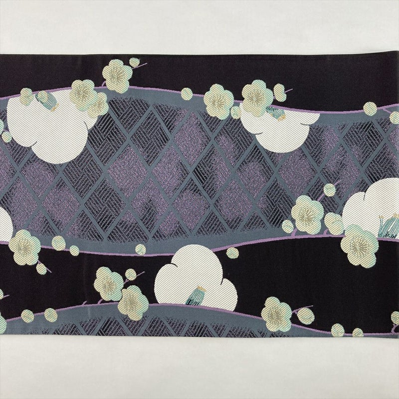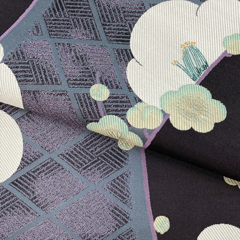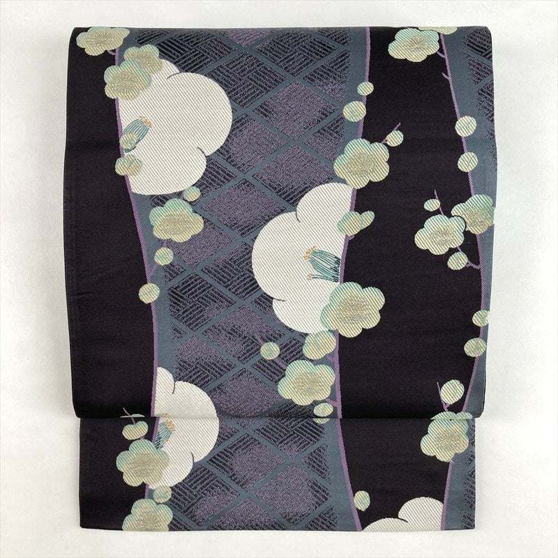 気品漂う白梅のモチーフが、和モダンな美しさを引き立てるセミフォーマル袋帯。