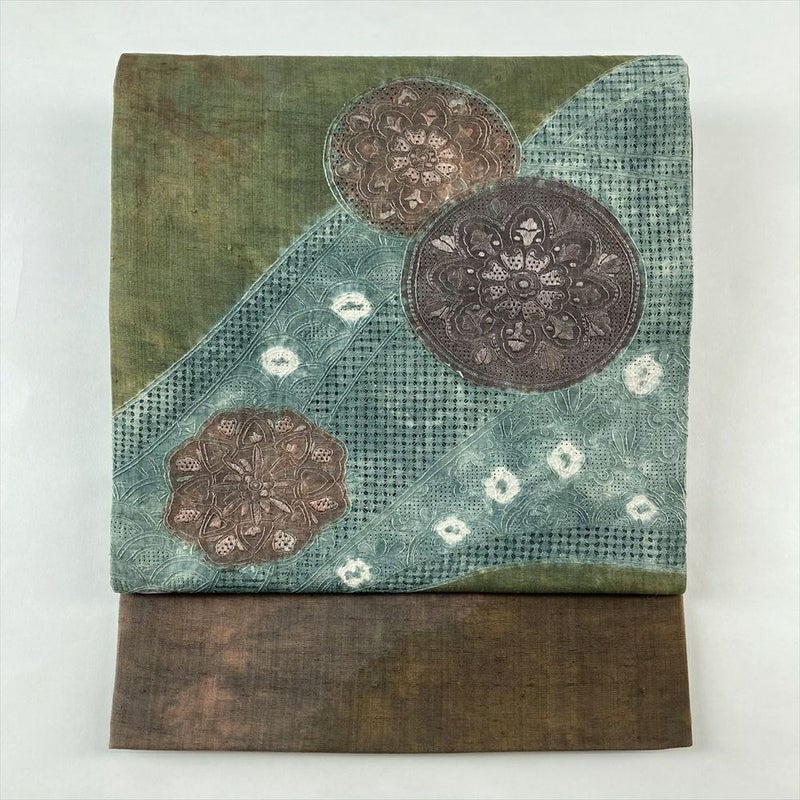 (中古)袋帯 緑 セミフォーマル 六通 紬地 刺繍 絞り 華文 絹 未洗い