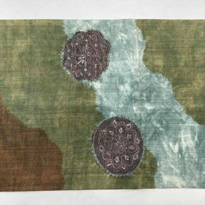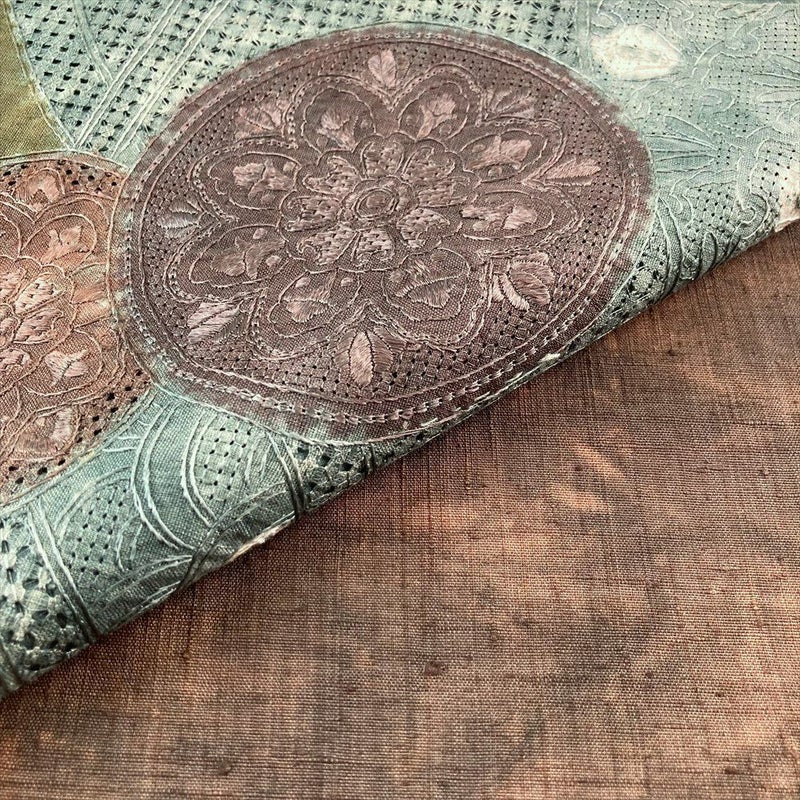 この洒落帯は、紬(つむぎ)地に汕頭刺繍(すわとうししゅう)と絞り(しぼり)で、華文(はなもん)を表現した一本。染めの技法も加わり、多彩な表情が魅力です。