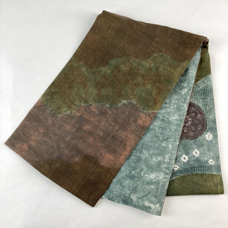素朴な風合いが魅力の紬地は、カジュアルながら品が良い印象。染めが加わることで、奥行きのある色彩が生まれ、帯全体に柔らかな表情をもたらします。