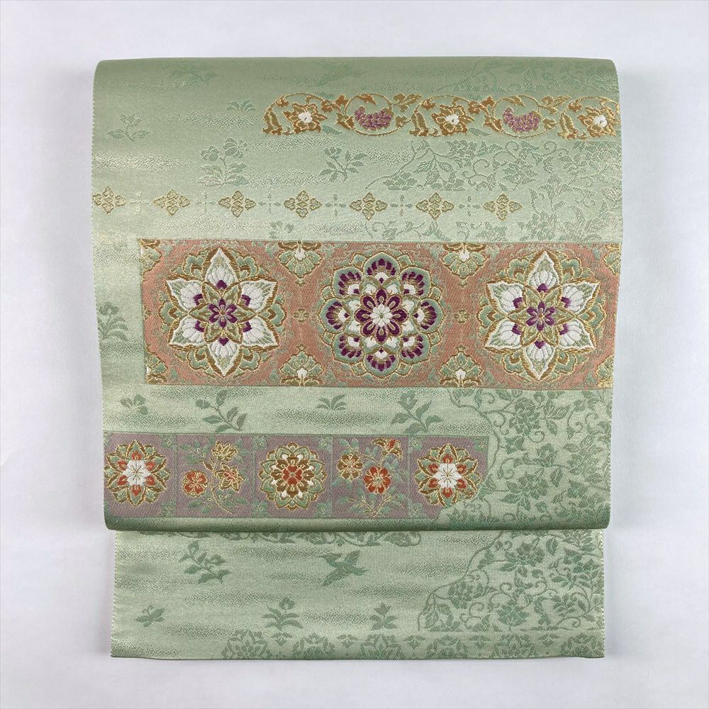 (中古)袋帯 薄緑 セミフォーマル フォーマル 六通 金糸 色糸 オリエンタル 華文 絹