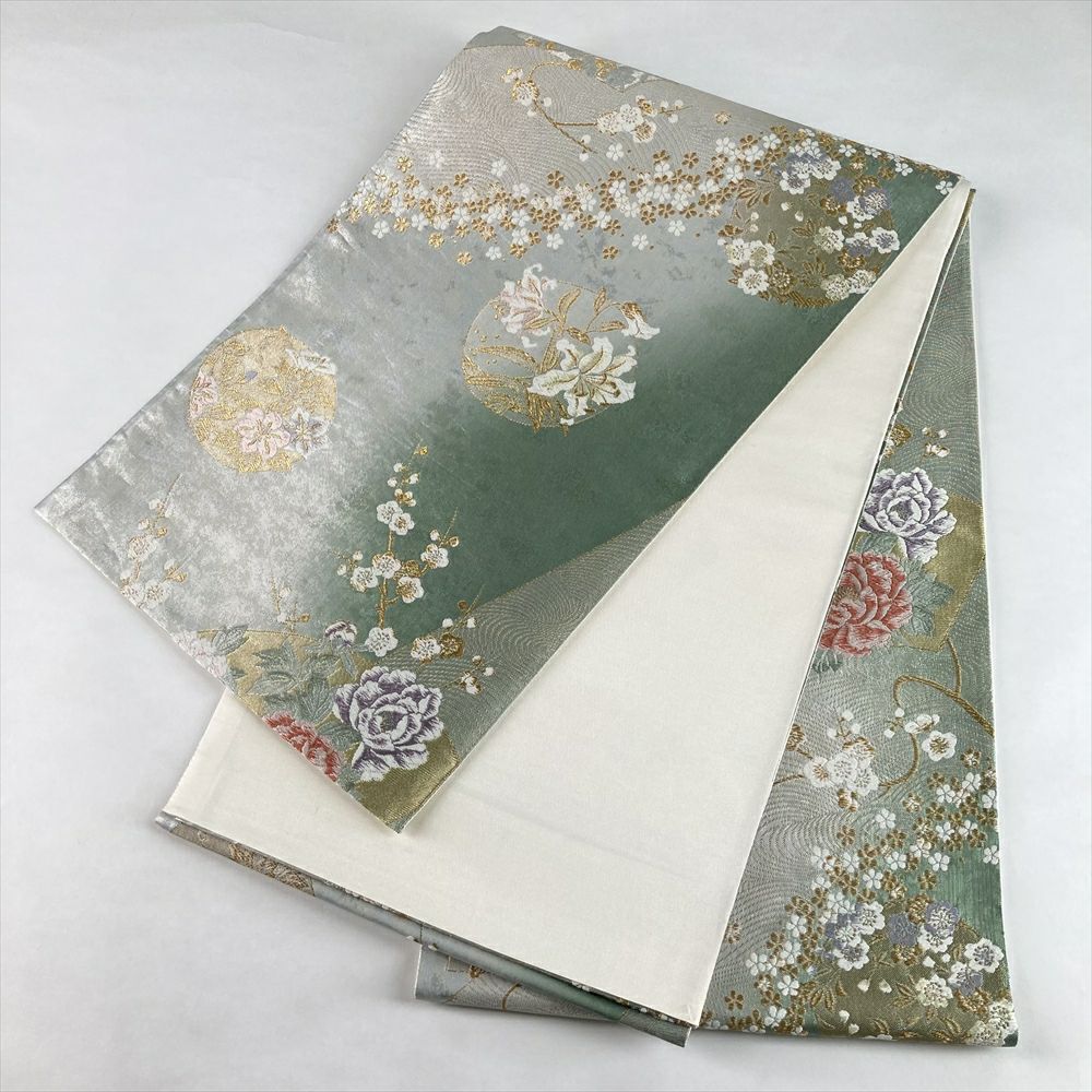 (中古)袋帯 銀 緑 セミフォーマル フォーマル 六通 引き箔 金糸 色糸 扇面文 絹