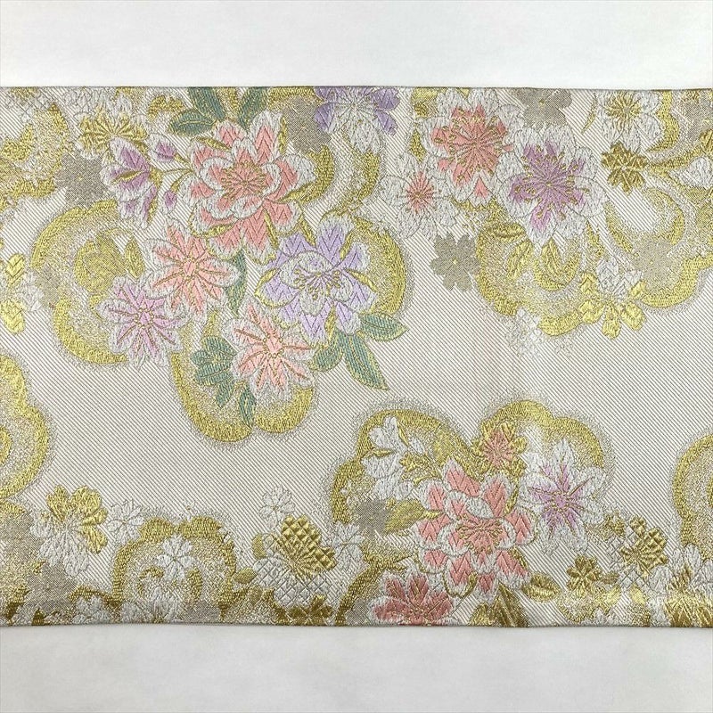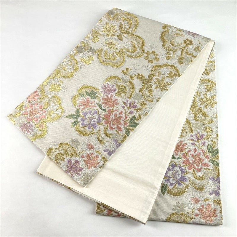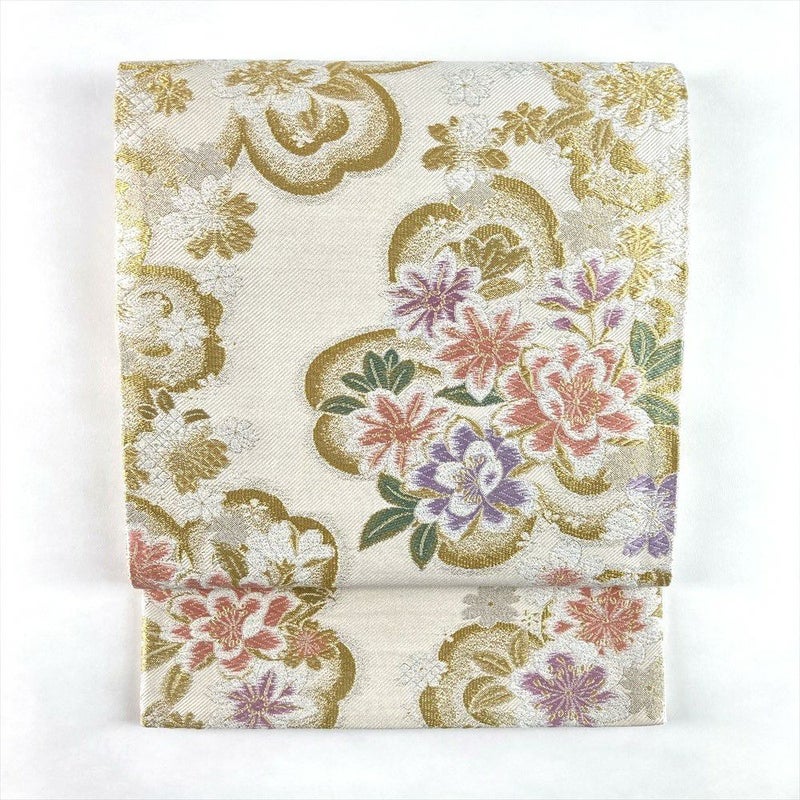 (中古)袋帯 アイボリー 生成り セミフォーマル フォーマル 六通 金糸 銀糸 色糸 桜尽くし 絹