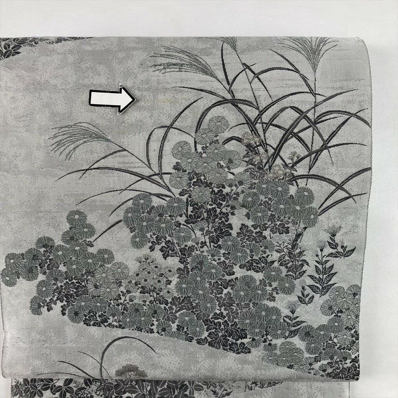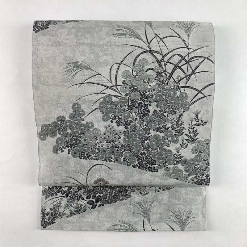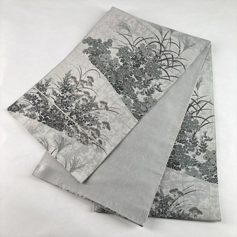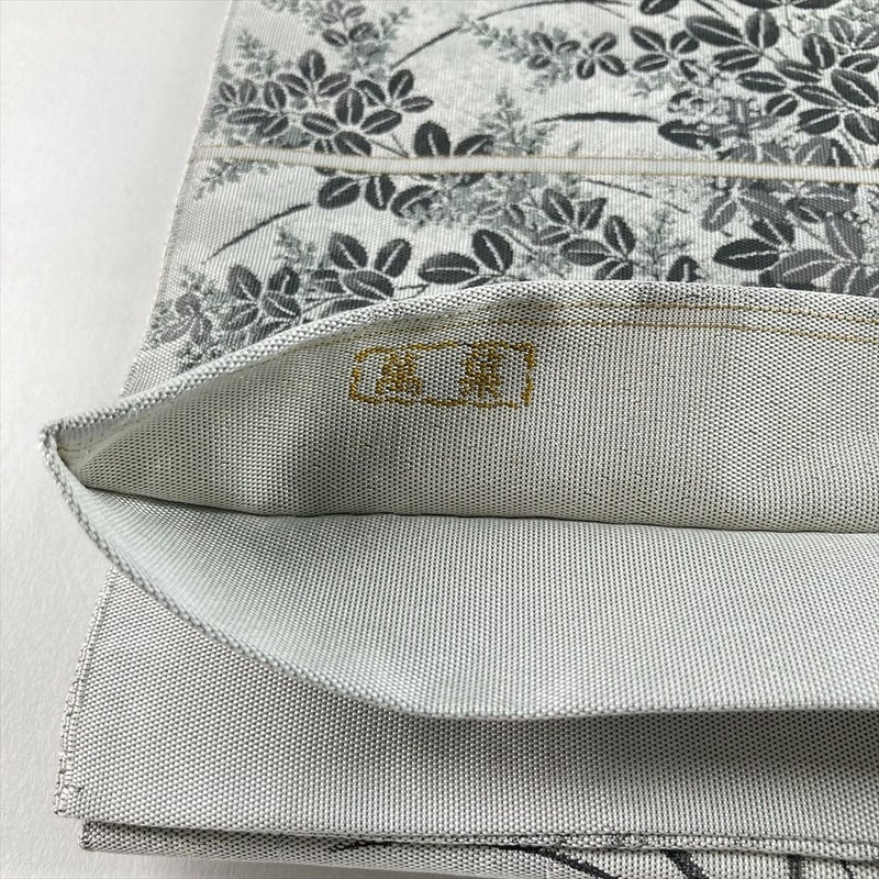 (中古)袋帯 薄灰 グレー カジュアル セミフォーマル 全通 織り 色糸 秋の草花文 絹