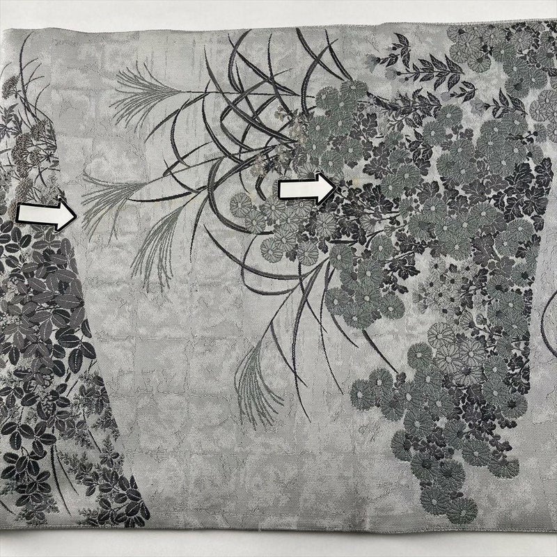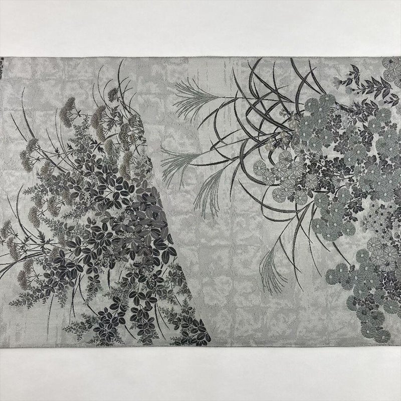 落ち着いたグレーの地に、薄(すすき)や女郎花(おみなえし)、萩、菊といった秋の代表的な草花が、丁寧に織り込まれています。