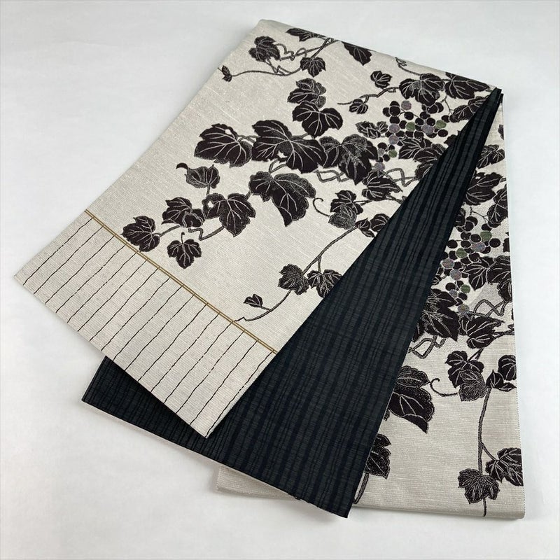 (中古)袋帯 白茶 カジュアル 両面全通 リバーシブル とみや織物 織り 蔓葡萄 絹