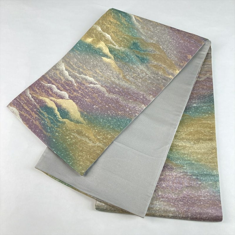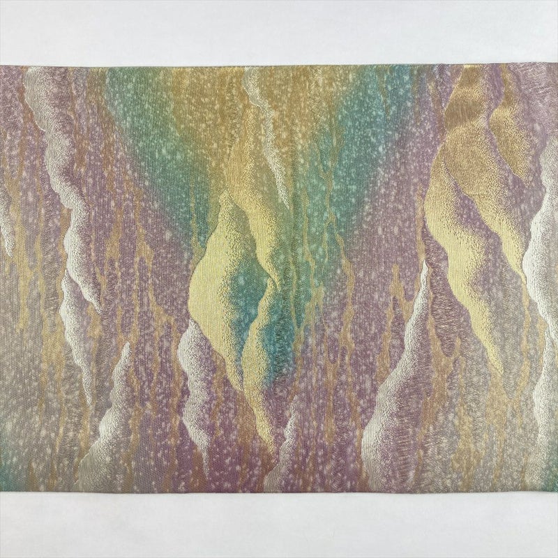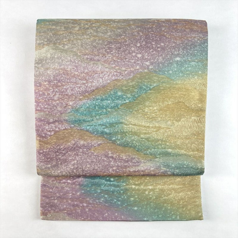 (中古)袋帯 紫 緑 黄 マルチカラー セミフォーマル 全通 織り 霞 山並み 絹
