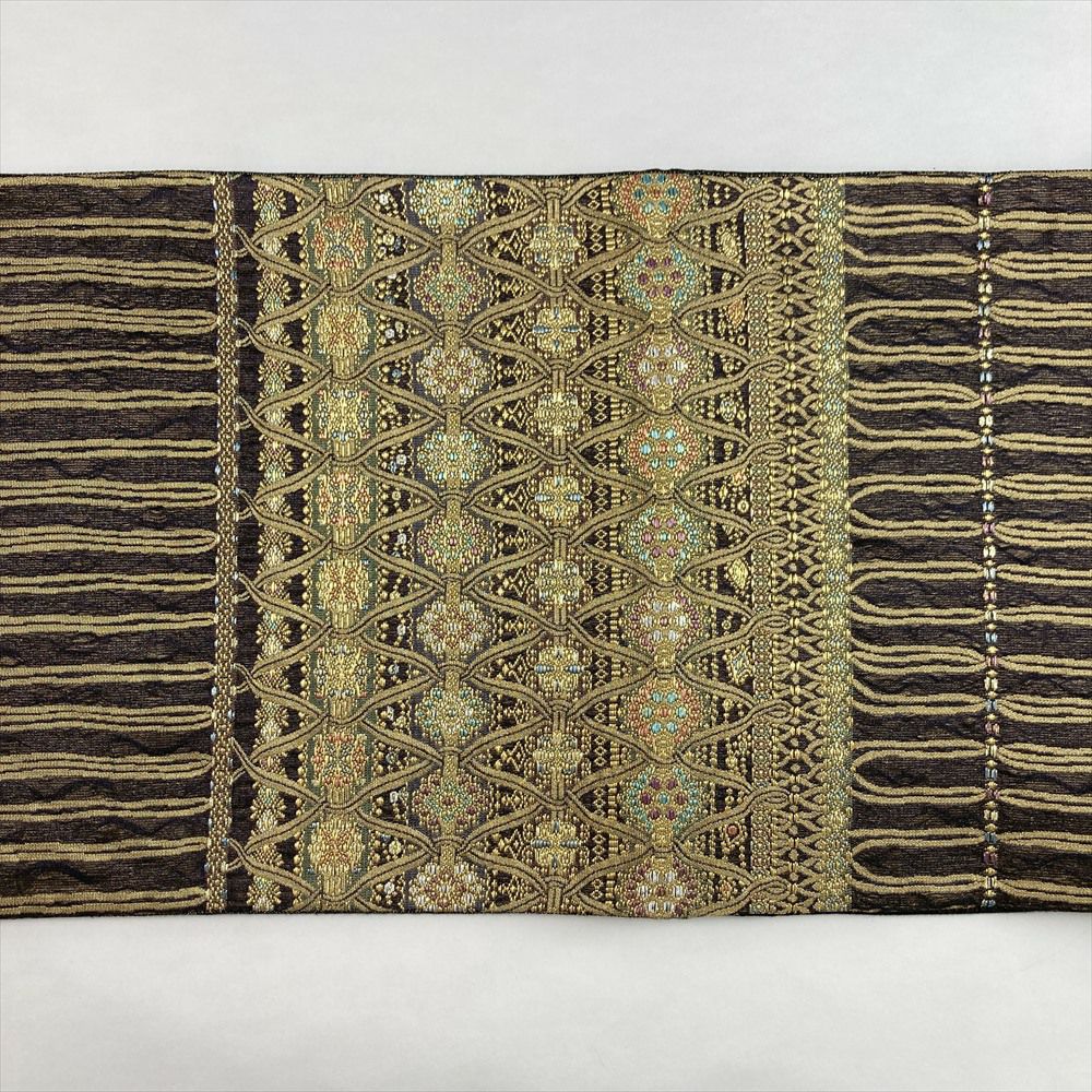 光を浴びて荘厳に輝く太箔の技法で、異国情緒あふれるオリエンタルな文様を表現した袋帯。