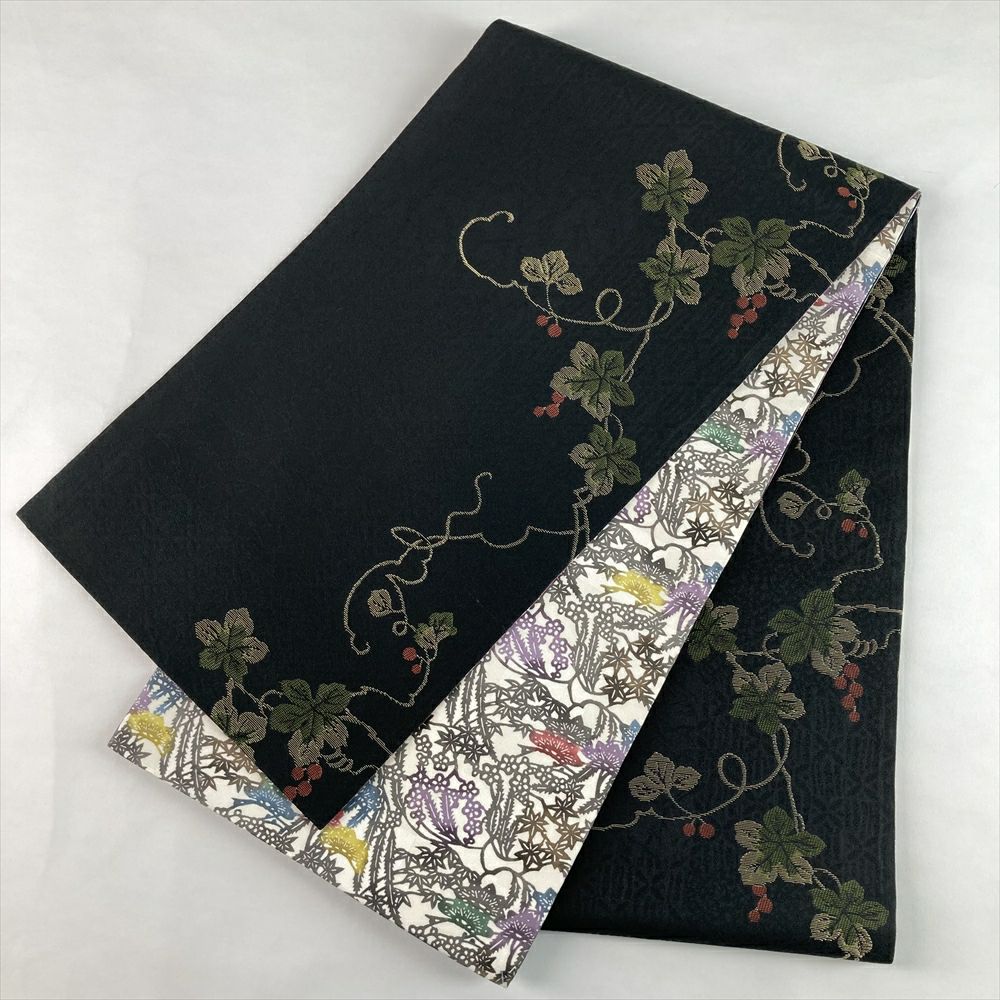 (中古)袋帯 黒 カジュアル 両面二図全通柄 リバーシブル 織り 江戸紅型染 蔦 草花文 絹