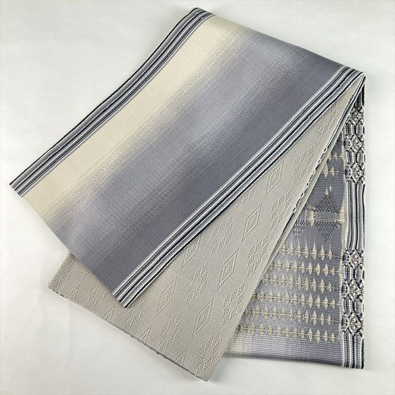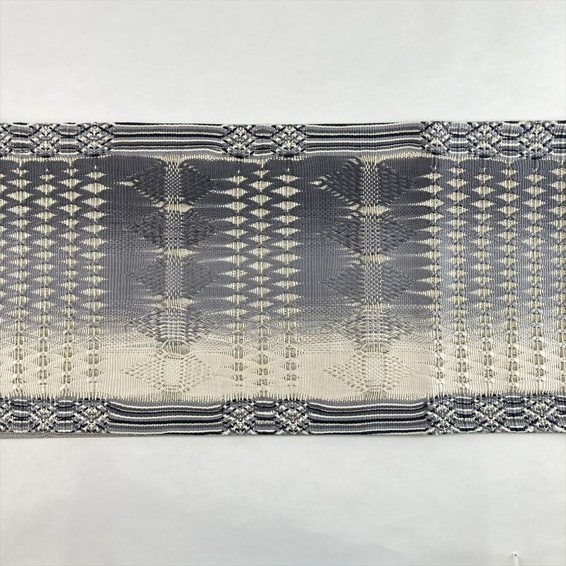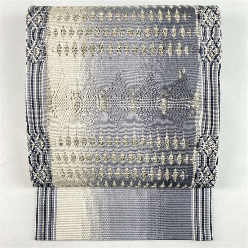 (中古)袋帯 白 灰青 グレー セミフォーマル フォーマル 六通 組織 幾何学柄 絹