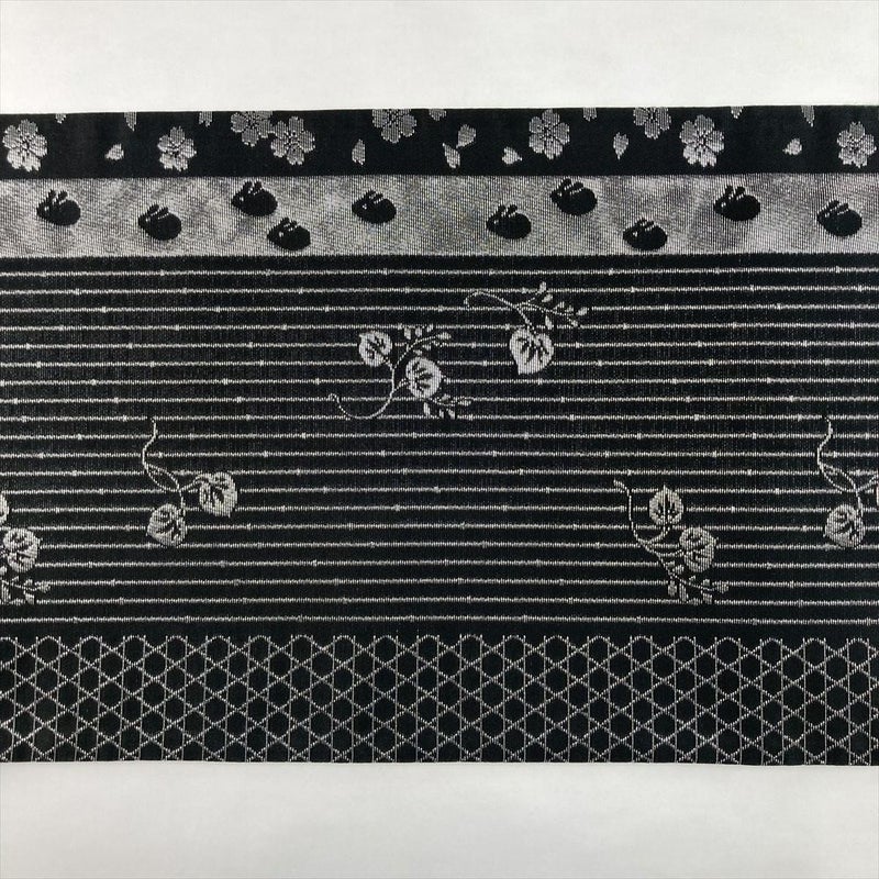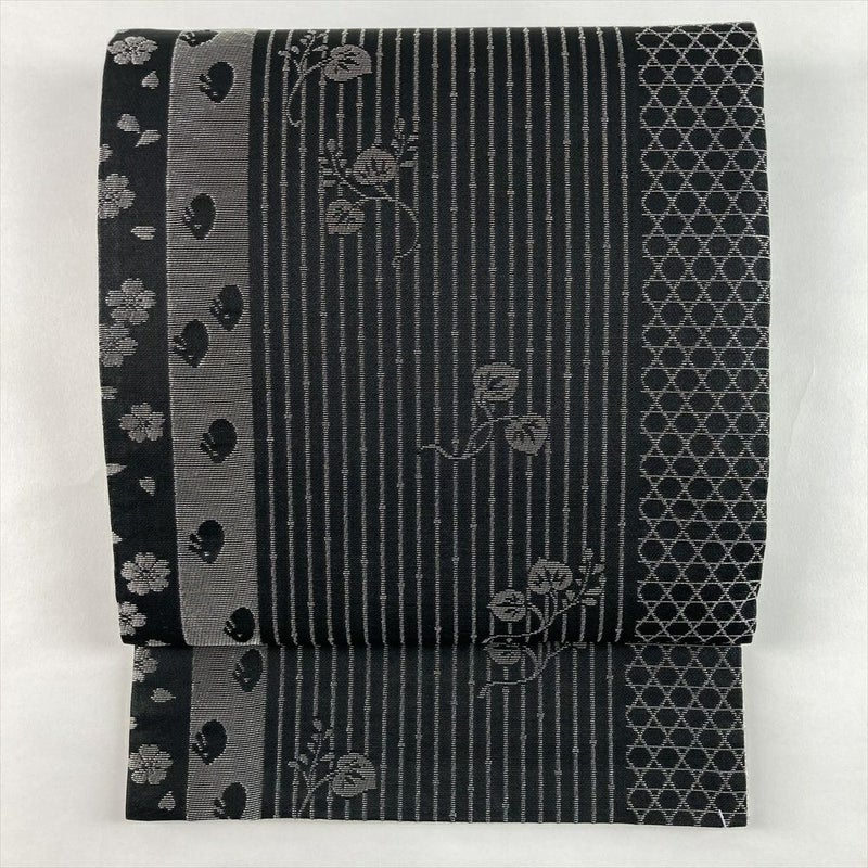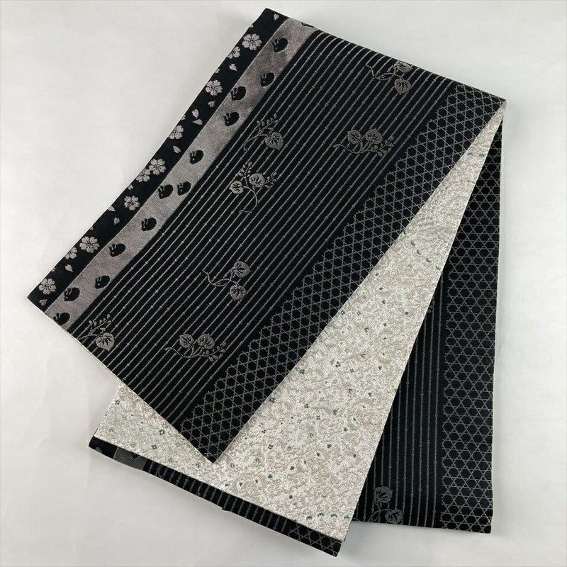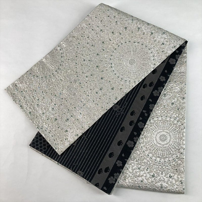 (中古)袋帯 銀 黒 セミフォーマル フォーマル 六通 両面 リバーシブル 金花山織 大華文 兎 桜 籠目 絹